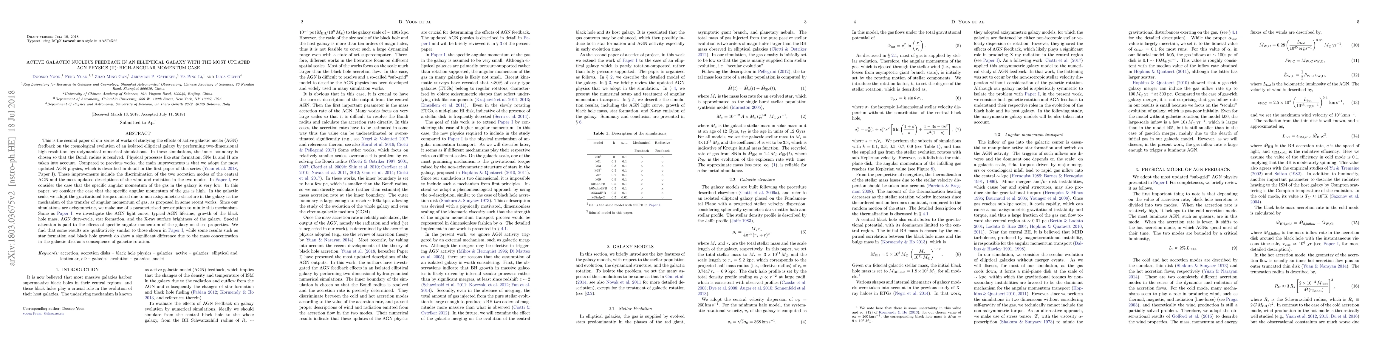 This paper explores the impact of active galactic nuclei (AGN) feedback on an isolated elliptical galaxy using high-resolution simulations with updated AGN physics, focusing on scenarios with high-angular momentum gas. It finds similarities and differences in AGN properties compared to low-angular momentum cases, particularly noting the effects of galactic rotation on star formation and black hole growth.