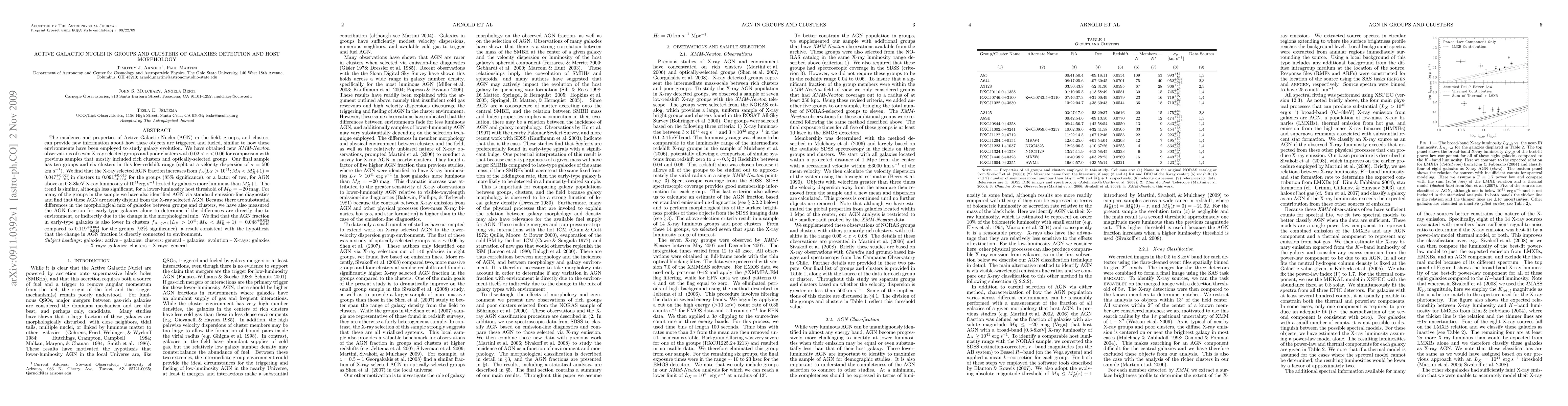This study investigates Active Galactic Nuclei (AGN) in low-redshift groups and clusters, finding a higher AGN fraction in groups compared to clusters, particularly among early-type galaxies, suggesting environmental factors influence AGN activity.