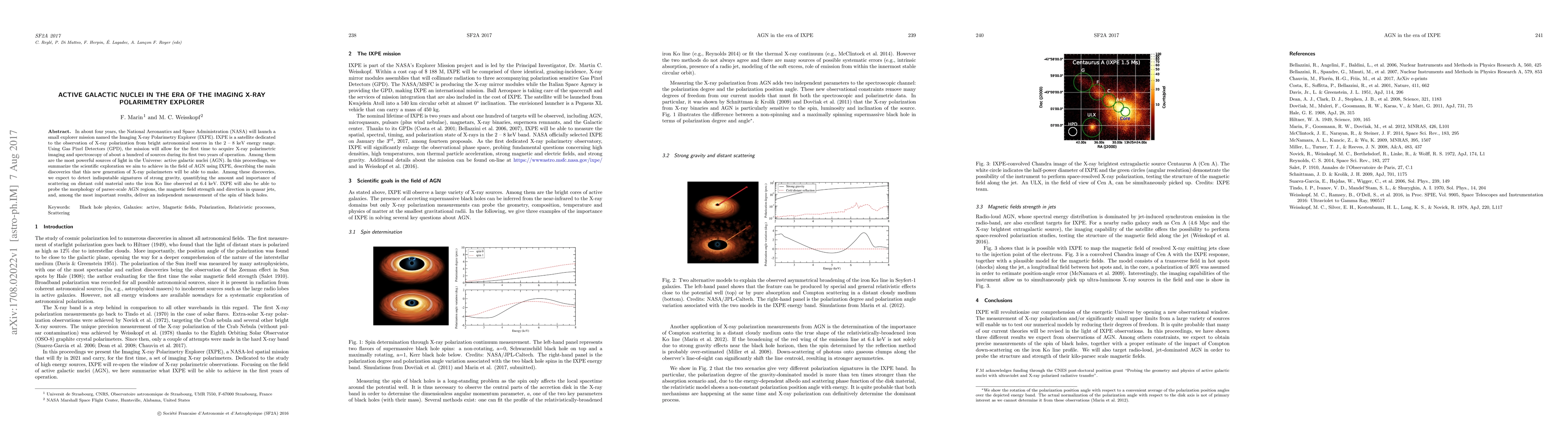 The Imaging X-ray Polarimetry Explorer (IXPE) aims to observe X-ray polarization from bright astronomical sources, including active galactic nuclei (AGN). IXPE will provide unprecedented insights into AGN, including detecting signatures of strong gravity, quantifying scattering effects, and measuring black hole spins.