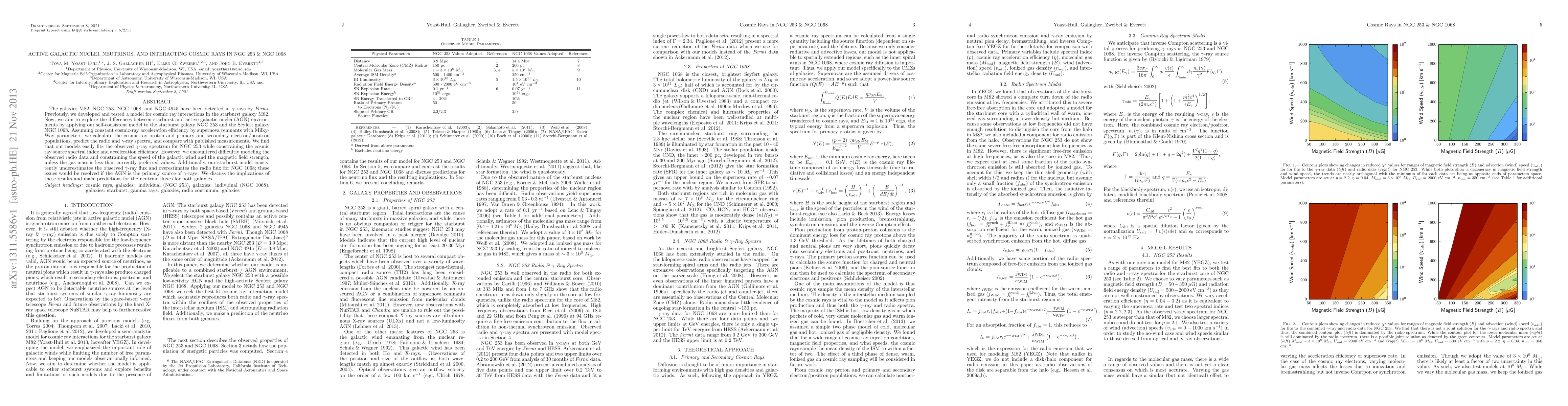 The galaxies M82, NGC 253, NGC 1068, and NGC 4945 have been detected in gamma-rays by Fermi. Previously, we developed and tested a model for cosmic ray interactions in the starburst galaxy M82. Now, we aim to explore the differences between starburst and active galactic nuclei (AGN) environments by applying our self-consistent model to the starburst galaxy NGC 253 and the Seyfert galaxy NGC 1068. Assuming constant cosmic-ray acceleration efficiency by supernova remnants with Milky-Way parameters, we calculate the cosmic-ray proton and primary and secondary electron/positron populations, predict the radio and gamma-ray spectra, and compare with published measurements. We find that our models easily fits the observed gamma-ray spectrum for NGC 253 while constraining the cosmic ray source spectral index and acceleration efficiency. However, we encountered difficultly modeling the observed radio data and constraining the speed of the galactic wind and the magnetic field strength, unless the gas mass is less than currently preferred values. Additionally, our starburst model consistently underestimates the observed gamma-ray flux and overestimates the radio flux for NGC 1068; these issues would be resolved if the AGN is the primary source of gamma-rays. We discuss the implications of these results and make predictions for the neutrino fluxes for both galaxies.