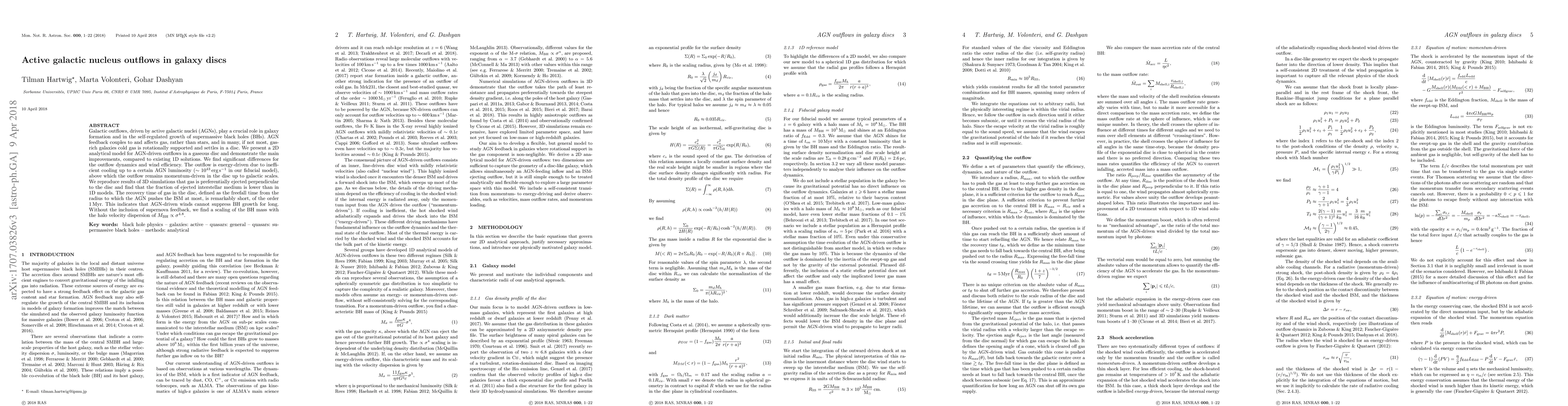 The research presents a 2D analytical model for AGN-driven outflows in gaseous discs, comparing it with 1D and 3D simulations to study the dynamics and efficiency of AGN feedback in galaxy formation.