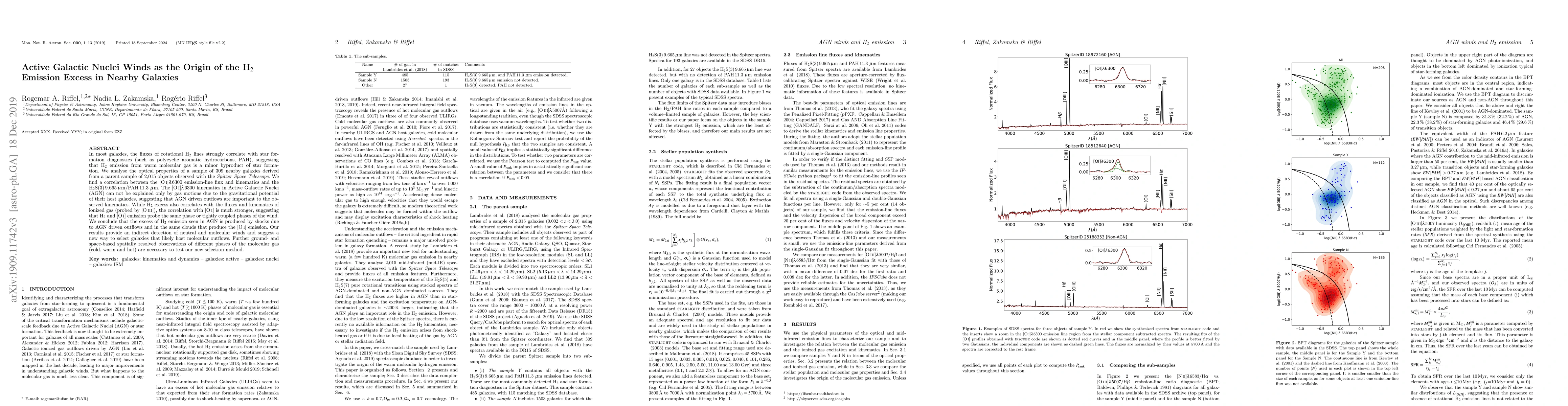 In most galaxies, the fluxes of rotational H2 lines strongly correlate with star formation diagnostics (such as polycyclic aromatic hydrocarbons, PAH), suggesting that H2 emission from warm molecular gas is a minor byproduct of star formation. We analyse the optical properties of a sample of 309 nearby galaxies derived from a parent sample of 2,015 objects observed with the Spitzer Space Telescope. We find a correlation between the [OI]6300 emission-line flux and kinematics and the H2 S(3)9.665um/PAH11.3um. The [OI]6300 kinematics in Active Galactic Nuclei (AGN) can not be explained only by gas motions due to the gravitational potential of their host galaxies, suggesting that AGN driven outflows are important to the observed kinematics. While H2 excess also correlates with the fluxes and kinematics of ionized gas (probed by [OIII]), the correlation with [OI] is much stronger, suggesting that H2 and [OI] emission probe the same phase or tightly coupled phases of the wind. We conclude that the excess of H2 emission seen in AGN is produced by shocks due to AGN driven outflows and in the same clouds that produce the [OI] emission. Our results provide an indirect detection of neutral and molecular winds and suggest a new way to select galaxies that likely host molecular outflows. Further ground- and space-based spatially resolved observations of different phases of the molecular gas (cold, warm and hot) are necessary to test our new selection method.