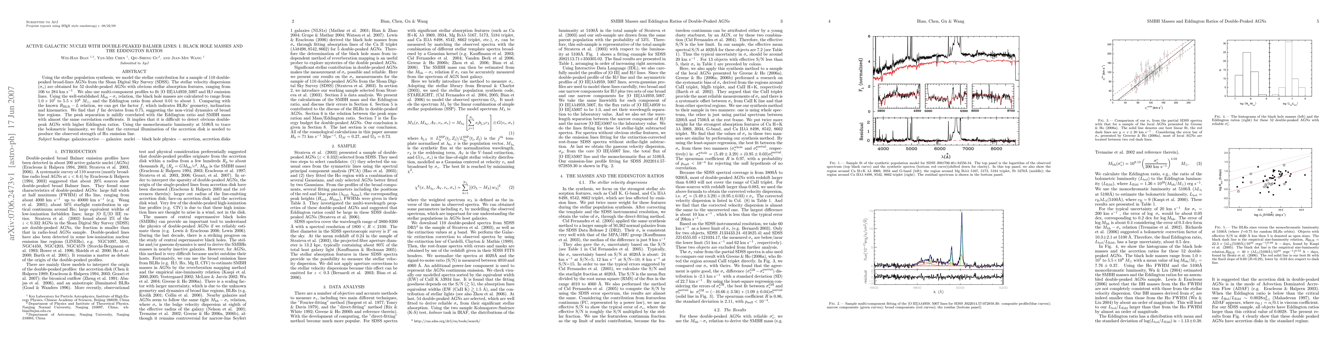 A study of 110 double-peaked active galactic nuclei (AGNs) from the Sloan Digital Sky Survey found black hole masses ranging from $1.0 imes 10^{7}$ to $5.5 imes 10^{8}$ $ ext{Msun}$ and Eddington ratios between 0.01 and 1, suggesting non-virial dynamics of broad line regions.