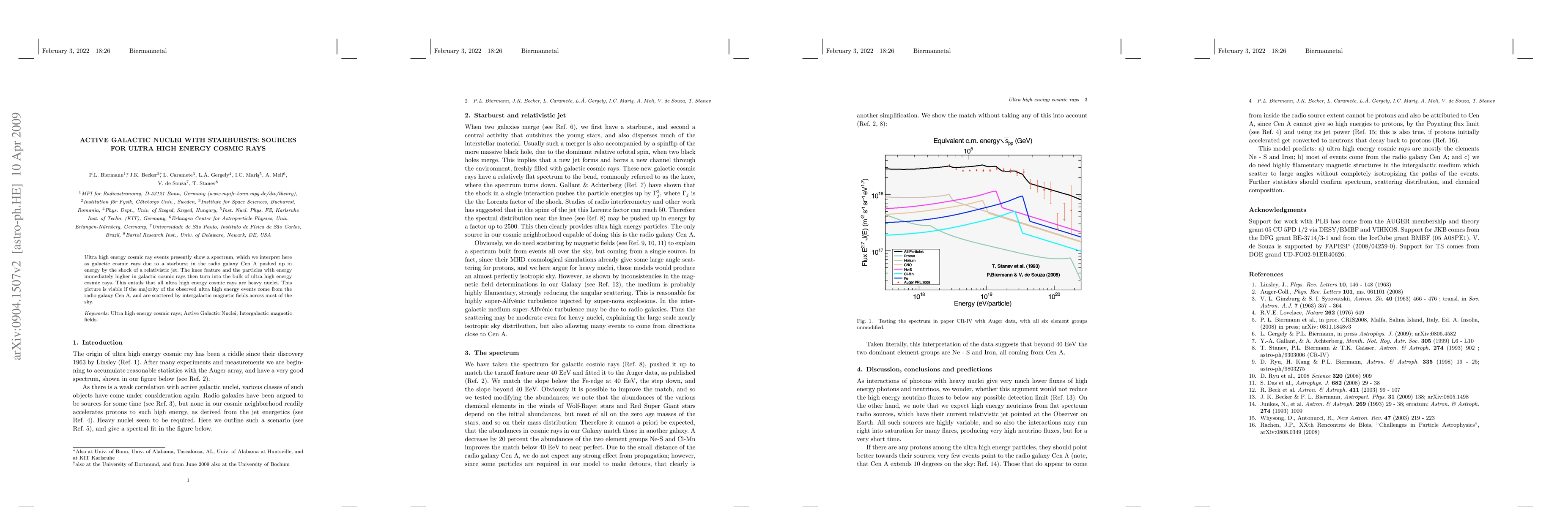 Summary: The paper suggests that ultra high energy cosmic rays may originate from starbursts in radio galaxies, such as Cen A, where relativistic jets amplify their energies. It posits that these cosmic rays are primarily heavy nuclei and that intergalactic magnetic fields disperse them across the sky.