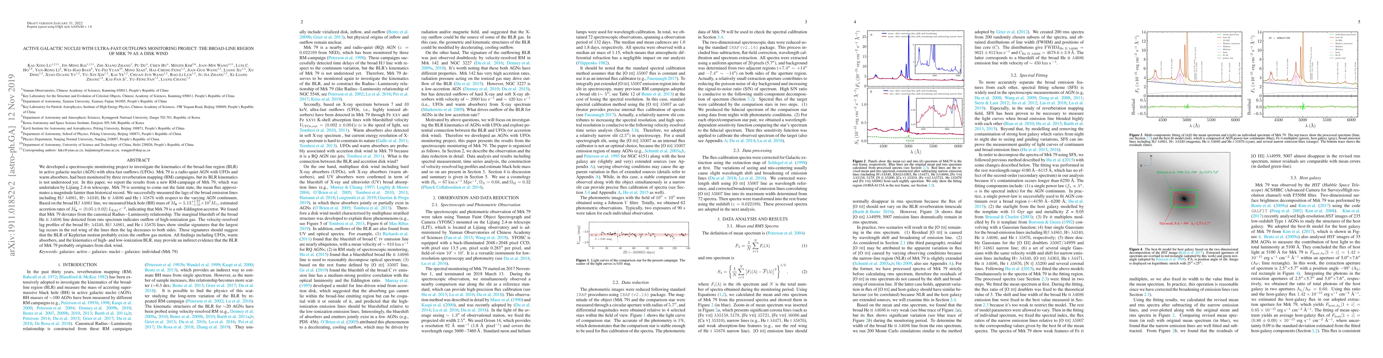 This paper reports on a spectroscopic monitoring project to study the broad-line region (BLR) kinematics in the AGN Mrk~79, revealing its deviation from the canonical Radius-Luminosity relationship and suggesting the presence of an outflowing disk wind. The study found that the BLR exhibits signatures indicative of Keplerian motion influenced by the outflow gas.