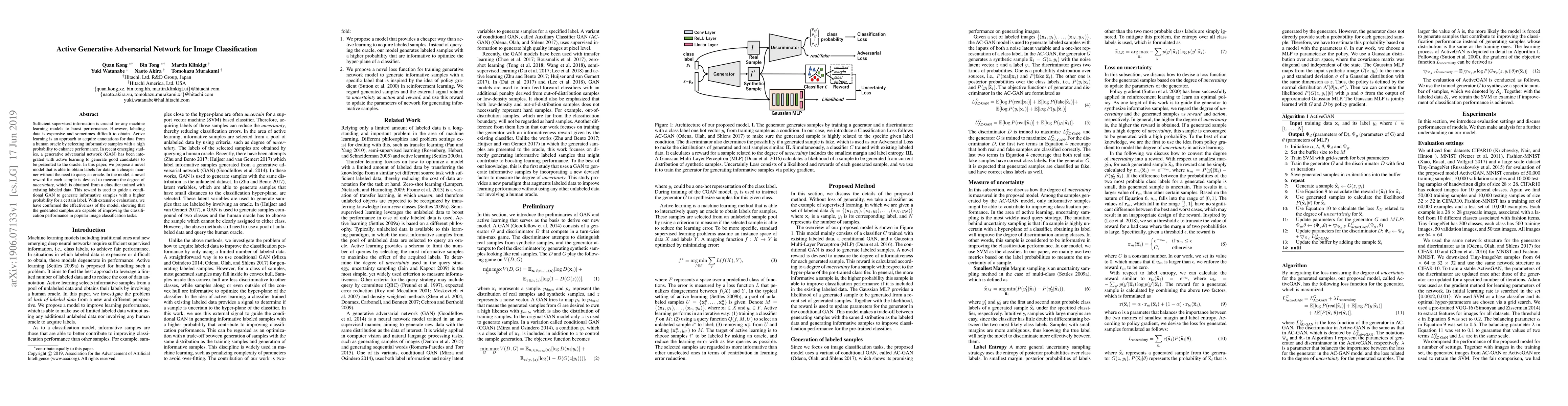 This paper proposes an active generative adversarial network (GAN) model for image classification that reduces the need for expensive human annotations by leveraging uncertainty measures from a classifier to guide a conditional GAN in generating informative samples, thereby improving classification performance. The model demonstrates effectiveness through extensive evaluations on popular image classification tasks.