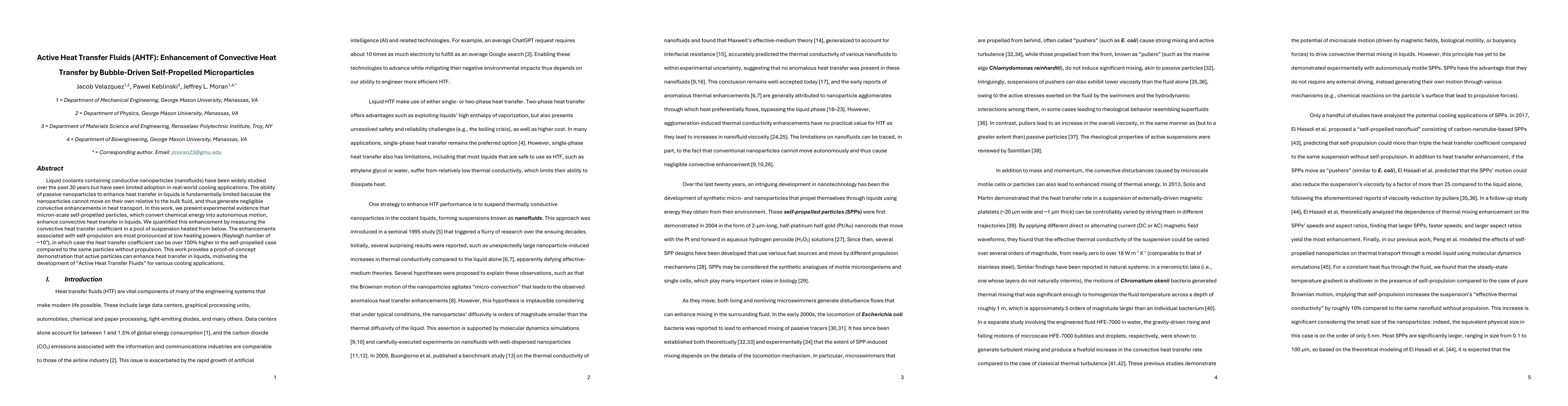 Liquid coolants containing conductive nanoparticles (nanofluids) have been widely studied over the past 30 years but have seen limited adoption in real-world cooling applications. The ability of passive nanoparticles to enhance heat transfer in liquids is fundamentally limited because the nanoparticles cannot move on their own relative to the bulk fluid, and thus generate negligible convective enhancements in heat transport. In this work, we present experimental evidence that micron-scale self-propelled particles, which convert chemical energy into autonomous motion, enhance convective heat transfer in liquids. We quantified this enhancement by measuring the convective heat transfer coefficient in a pool of suspension heated from below. The enhancements associated with self-propulsion are most pronounced at low heating powers (Rayleigh number of 10,000), in which case the heat transfer coefficient can be over 100 percent higher in the self-propelled case compared to the same particles without propulsion. This work provides a proof-of-concept demonstration that active particles can enhance heat transfer in liquids, motivating the development of "Active Heat Transfer Fluids" for various cooling applications.