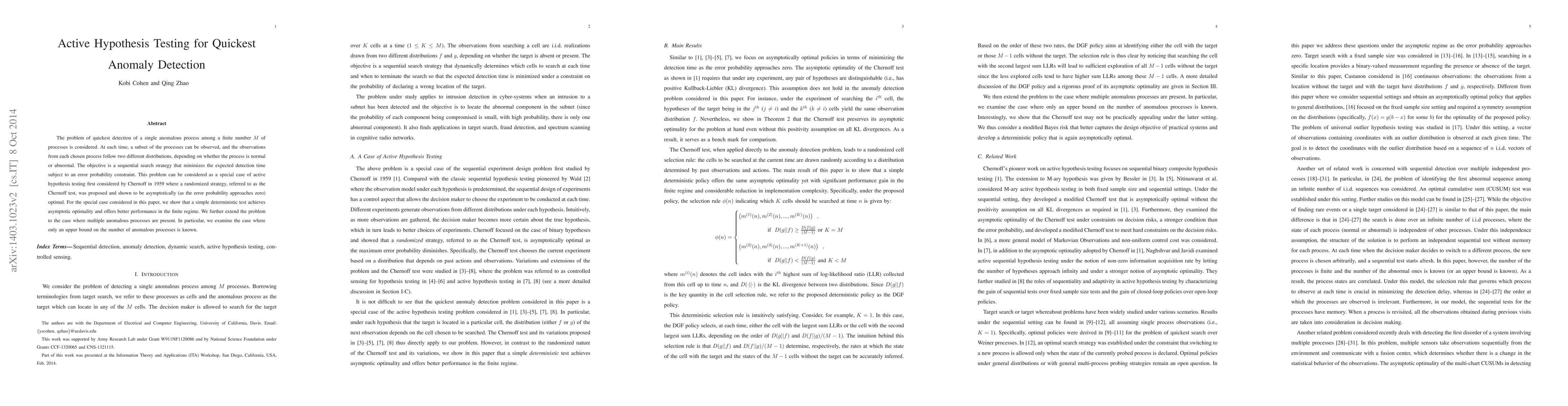 The problem of quickest detection of an anomalous process among M processes is considered. At each time, a subset of the processes can be observed, and the observations from each chosen process follow two different distributions, depending on whether the process is normal or abnormal. The objective is a sequential search strategy that minimizes the expected detection time subject to an error probability constraint. This problem can be considered as a special case of active hypothesis testing first considered by Chernoff in 1959 where a randomized strategy, referred to as the Chernoff test, was proposed and shown to be asymptotically (as the error probability approaches zero) optimal. For the special case considered in this paper, we show that a simple deterministic test achieves asymptotic optimality and offers better performance in the finite regime. We further extend the problem to the case where multiple anomalous processes are present. In particular, we examine the case where only an upper bound on the number of anomalous processes is known.