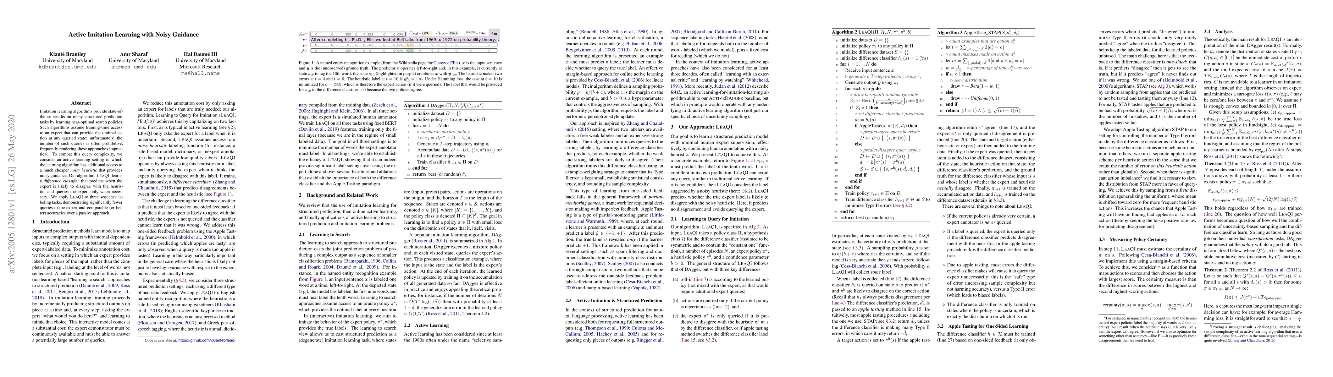 The paper introduces LEAQI, an active imitation learning algorithm that leverages a noisy heuristic to reduce the number of queries to an expensive expert, achieving comparable or better accuracy on sequence labeling tasks compared to passive approaches. The algorithm learns when to trust the heuristic versus when to consult the expert, thus minimizing expert queries.