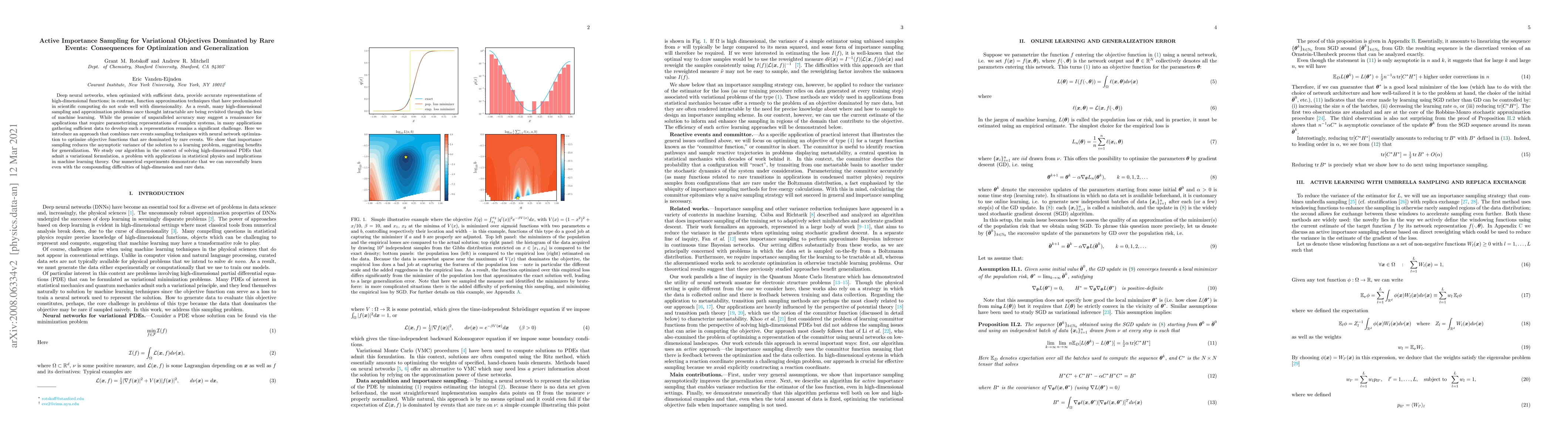 Deep neural networks, when optimized with sufficient data, provide accurate representations of high-dimensional functions; in contrast, function approximation techniques that have predominated in scientific computing do not scale well with dimensionality. As a result, many high-dimensional sampling and approximation problems once thought intractable are being revisited through the lens of machine learning. While the promise of unparalleled accuracy may suggest a renaissance for applications that require parameterizing representations of complex systems, in many applications gathering sufficient data to develop such a representation remains a significant challenge. Here we introduce an approach that combines rare events sampling techniques with neural network optimization to optimize objective functions that are dominated by rare events. We show that importance sampling reduces the asymptotic variance of the solution to a learning problem, suggesting benefits for generalization. We study our algorithm in the context of learning dynamical transition pathways between two states of a system, a problem with applications in statistical physics and implications in machine learning theory. Our numerical experiments demonstrate that we can successfully learn even with the compounding difficulties of high-dimension and rare data.