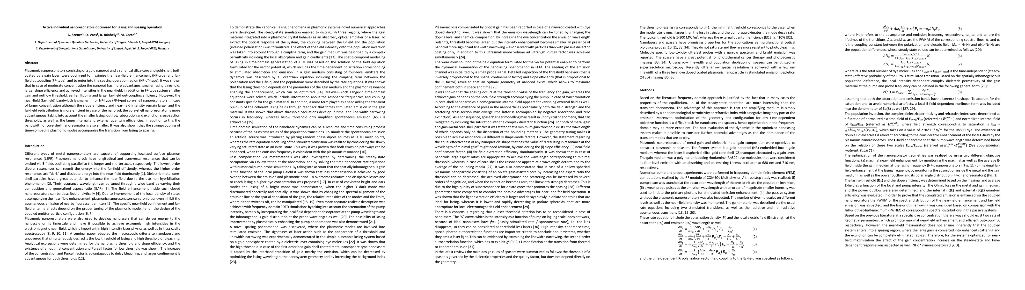 Plasmonic nanoresonators consisting of a gold nanorod and a spherical silica-core and gold-shell, both coated by a gain layer, were optimized to maximize the near-field enhancement (NF-type) and far-field outcoupling (FF-type), and to enter into the spasing operation region (NF-c*-type). It was shown that in case of moderate concentration the nanorod has more advantages: smaller lasing threshold, larger slope efficiency and achieved intensities in the near-field, in addition in FF-type system smaller gain and outflow threshold, earlier flipping and larger far-field out-coupling efficiency. However, the near-field (far-field) bandwidth is smaller in for NF-type (FF-type) core-shell nanoresonators. In case of larger concentration although the slope efficiency and near-field intensity remain larger and the far-field redistribution is more efficient in case of the nanorod, the core-shell nanoresonator is more advantageous, taking into account the smaller lasing, outflow, absorption and extinction cross-section thresholds, as well as the larger internal and external quantum efficiencies. In addition to this the bandwidth of core-shell nanoresonator is also smaller. It was also shown that the strong-coupling of time-competing plasmonic modes accompanies the transition from lasing to spasing.