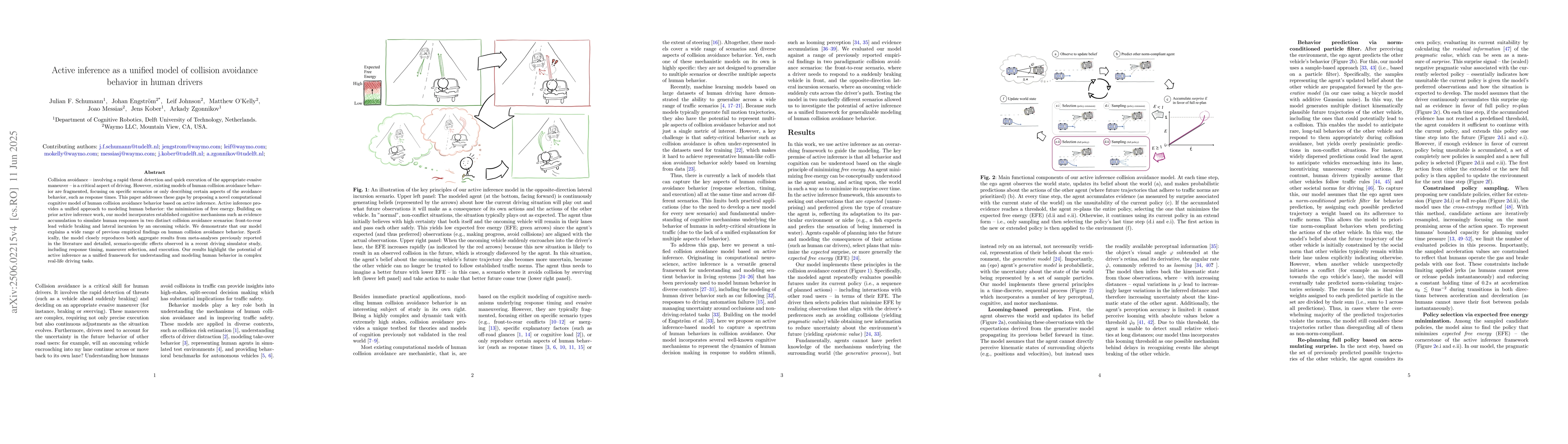 The paper proposes a computational cognitive model of human collision avoidance behavior based on active inference, incorporating established cognitive mechanisms like evidence accumulation to simulate responses in two distinct scenarios: front-to-rear lead vehicle braking and lateral incursion by an oncoming vehicle.