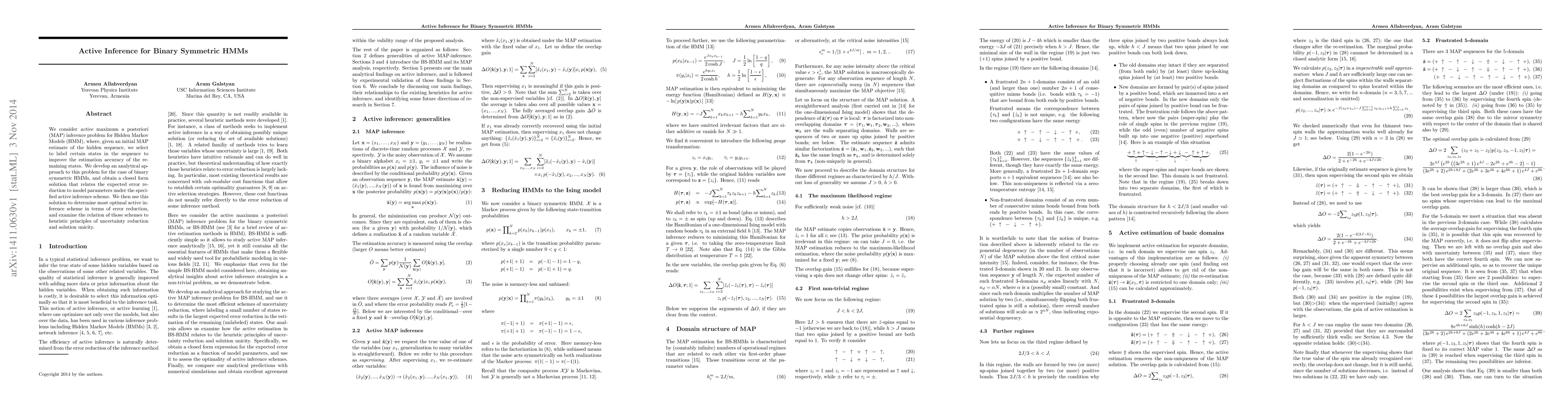 We consider active maximum a posteriori (MAP) inference problem for Hidden Markov Models (HMM), where, given an initial MAP estimate of the hidden sequence, we select to label certain states in the sequence to improve the estimation accuracy of the remaining states. We develop an analytical approach to this problem for the case of binary symmetric HMMs, and obtain a closed form solution that relates the expected error reduction to model parameters under the specified active inference scheme. We then use this solution to determine most optimal active inference scheme in terms of error reduction, and examine the relation of those schemes to heuristic principles of uncertainty reduction and solution unicity.