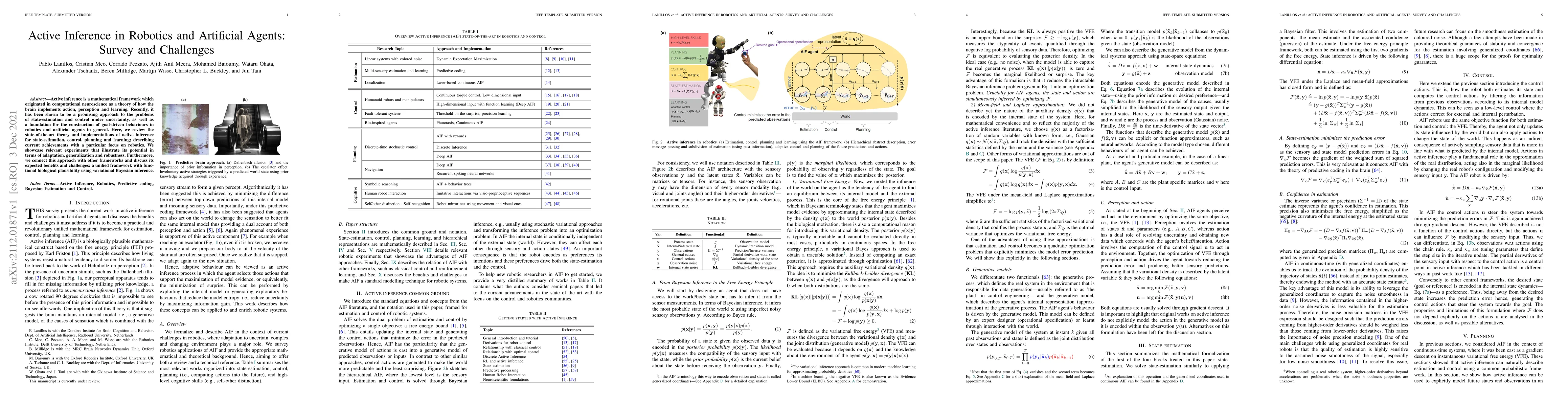 This paper surveys active inference, a framework from computational neuroscience applied to robotics and artificial agents, highlighting its use in state-estimation, control, and goal-driven behavior. It discusses current achievements and challenges, emphasizing its potential for adaptation, generalization, and robustness.