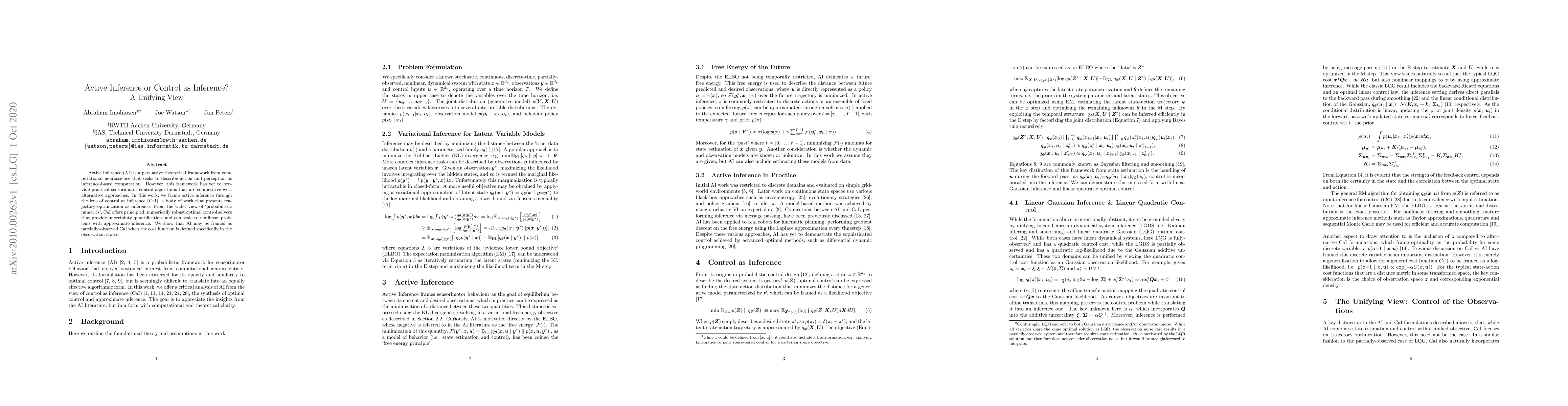 This paper unifies active inference with control as inference (CaI) by framing active inference as a special case of CaI, leveraging the probabilistic numerics framework for optimal control. It demonstrates that active inference can be seen as partially-observed CaI, offering principled, numerically robust control algorithms with uncertainty quantification.
