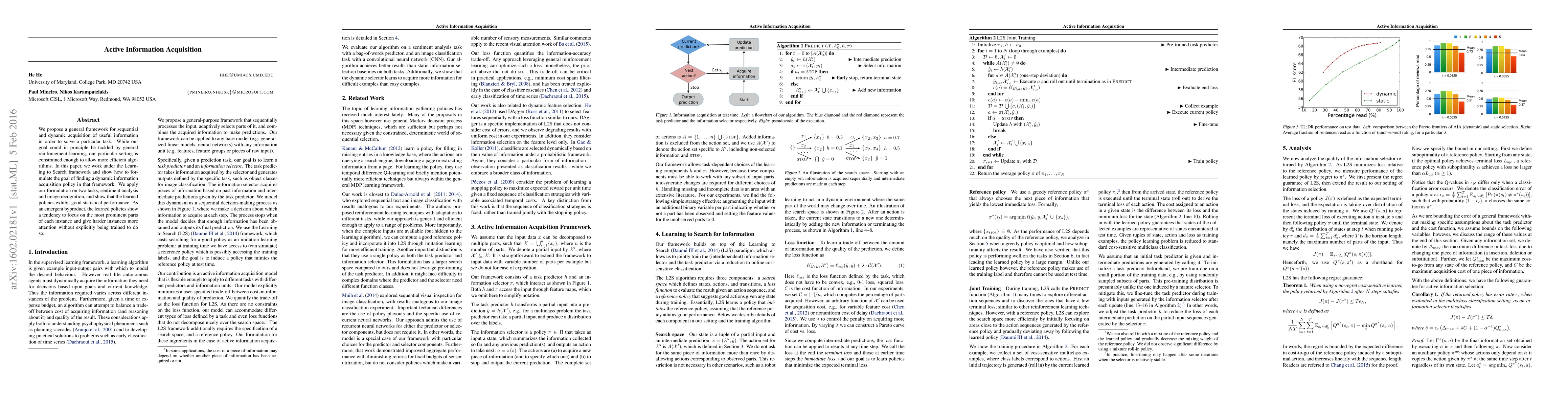 We propose a general framework for sequential and dynamic acquisition of useful information in order to solve a particular task. While our goal could in principle be tackled by general reinforcement learning, our particular setting is constrained enough to allow more efficient algorithms. In this paper, we work under the Learning to Search framework and show how to formulate the goal of finding a dynamic information acquisition policy in that framework. We apply our formulation on two tasks, sentiment analysis and image recognition, and show that the learned policies exhibit good statistical performance. As an emergent byproduct, the learned policies show a tendency to focus on the most prominent parts of each instance and give harder instances more attention without explicitly being trained to do so.