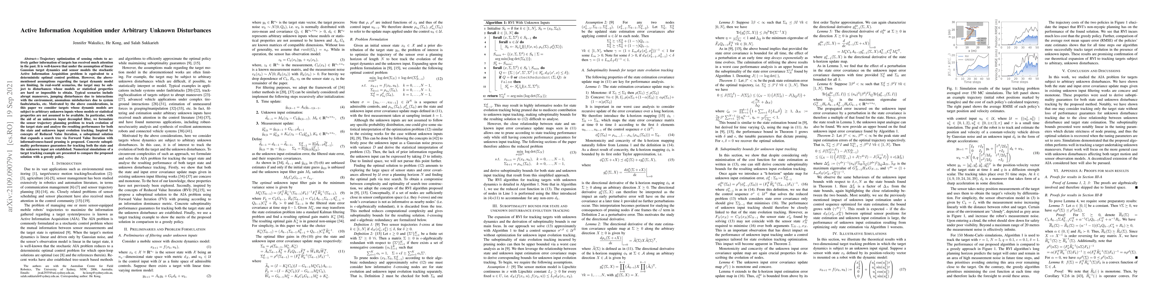 Trajectory optimization of sensing robots to actively gather information of targets has received much attention in the past. It is well-known that under the assumption of linear Gaussian target dynamics and sensor models the stochastic Active Information Acquisition problem is equivalent to a deterministic optimal control problem. However, the above-mentioned assumptions regarding the target dynamic model are limiting. In real-world scenarios, the target may be subject to disturbances whose models or statistical properties are hard or impossible to obtain. Typical scenarios include abrupt maneuvers, jumping disturbances due to interactions with the environment, anomalous misbehaviors due to system faults/attacks, etc. Motivated by the above considerations, in this paper we consider targets whose dynamic models are subject to arbitrary unknown inputs whose models or statistical properties are not assumed to be available. In particular, with the aid of an unknown input decoupled filter, we formulate the sensor trajectory planning problem to track evolution of the target state and analyse the resulting performance for both the state and unknown input evolution tracking. Inspired by concepts of Reduced Value Iteration, a suboptimal solution that expands a search tree via Forward Value Iteration with informativeness-based pruning is proposed. Concrete suboptimality performance guarantees for tracking both the state and the unknown input are established. Numerical simulations of a target tracking example are presented to compare the proposed solution with a greedy policy.
