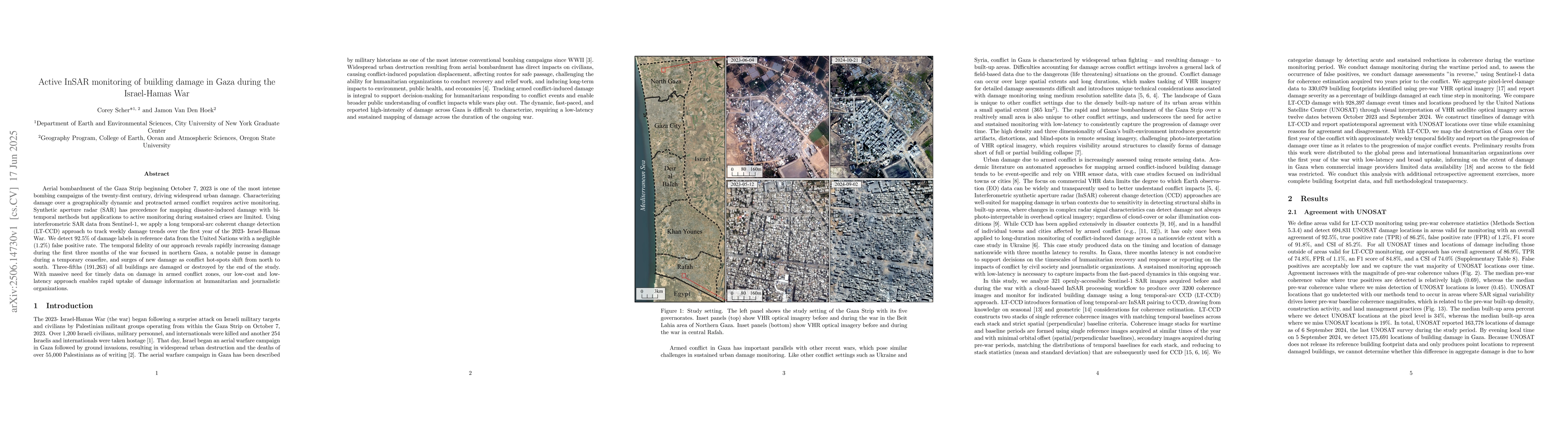 This research uses Sentinel-1 SAR data and a Long Temporal-Arc Coherent Change Detection (LT-CCD) method to monitor building damage in Gaza during the 2023 Israel-Hamas War. It accurately detected 92.5% of damage with minimal false positives, revealing damage trends over the first year. The findings show rapid damage increase initially in the north, a pause during a ceasefire, and subsequent shifts to the south, with 191,263 buildings damaged or destroyed by war's end.