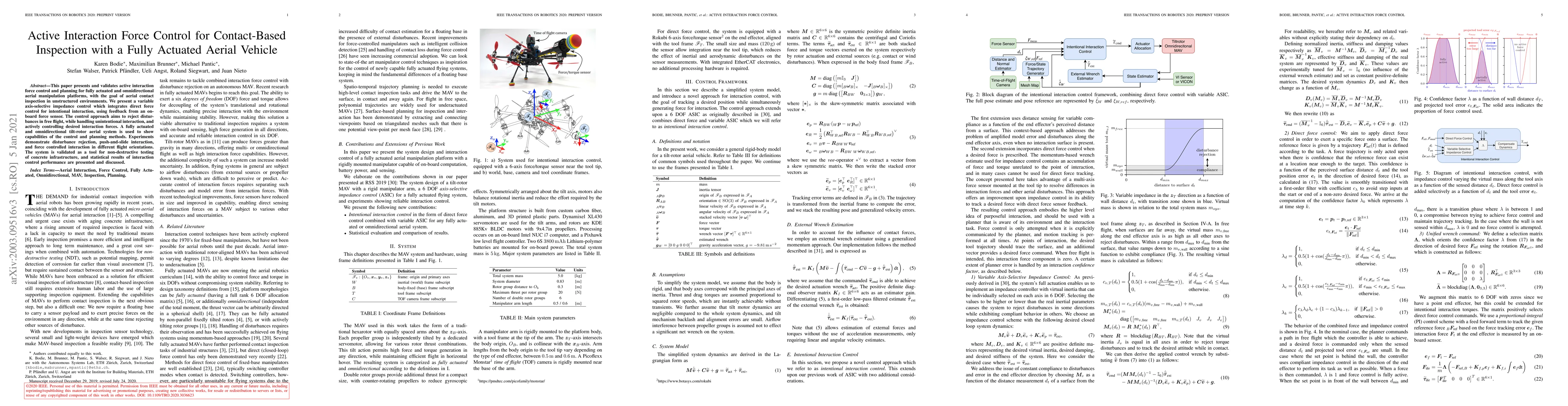 This paper presents and validates active interaction force control and planning for fully actuated and omnidirectional aerial manipulation platforms, with the goal of aerial contact inspection in unstructured environments. We present a variable axis-selective impedance control which integrates direct force control for intentional interaction, using feedback from an on-board force sensor. The control approach aims to reject disturbances in free flight, while handling unintentional interaction, and actively controlling desired interaction forces. A fully actuated and omnidirectional tilt-rotor aerial system is used to show capabilities of the control and planning methods. Experiments demonstrate disturbance rejection, push-and-slide interaction, and force controlled interaction in different flight orientations. The system is validated as a tool for non-destructive testing of concrete infrastructure, and statistical results of