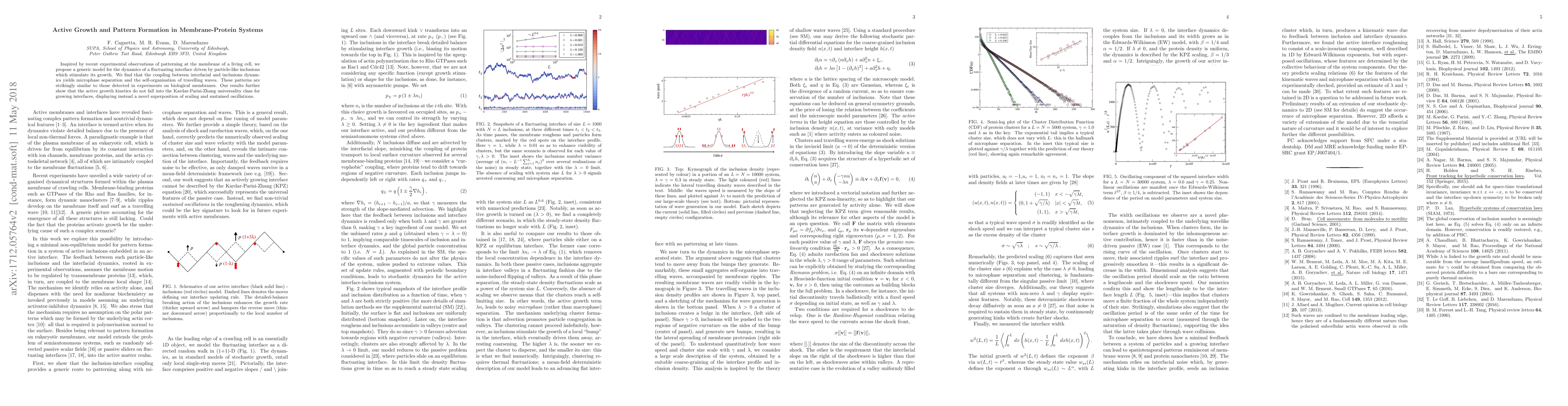 Inspired by recent experimental observation of patterning at the membrane of a living cell, we propose a generic model for the dynamics of a fluctuating interface driven by particle-like inclusions which stimulate its growth. We find that the coupling between interfacial and inclusions dynam- ics yields microphase separation and the self-organisation of travelling waves. These patterns are strikingly similar to those detected in the aforementioned experiments on actin-protein systems. Our results further show that the active growth kinetics does not fall into the Kardar-Parisi-Zhang universality class for growing interfaces, displaying instead a novel superposition of equilibrium-like scaling and sustained oscillations.