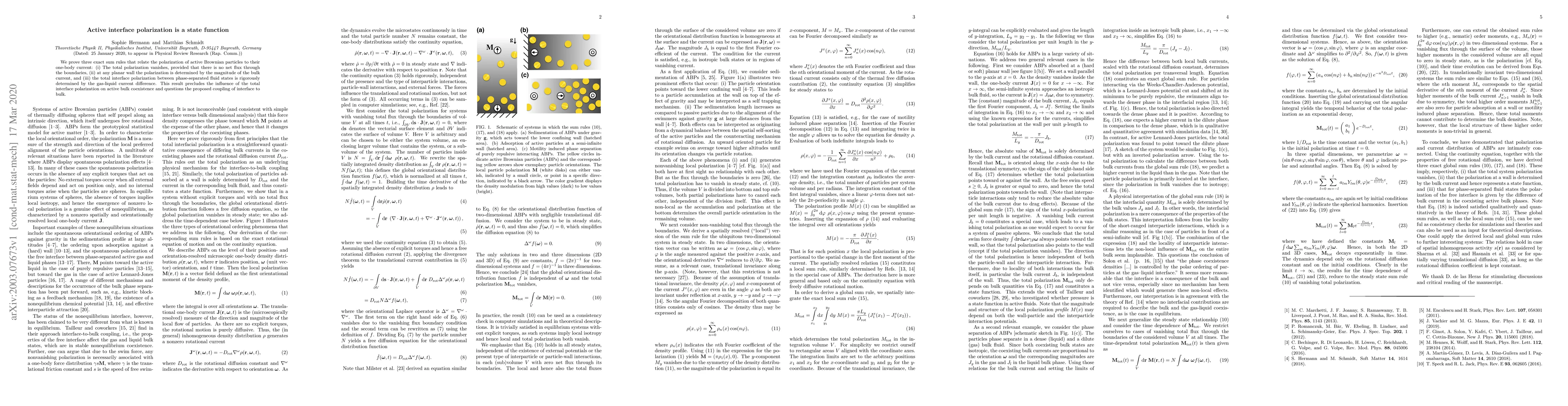 We prove three exact sum rules that relate the polarization of active Brownian particles to their one-body current: (i) The total polarization vanishes, provided that there is no net flux through the boundaries, (ii) at any planar wall the polarization is determined by the magnitude of the bulk current, and (iii) the total interface polarization between phase-separated fluid states is rigorously determined by the gas-liquid current difference. This result precludes the influence of the total interface polarization on active bulk coexistence and questions the proposed coupling of interface to bulk.