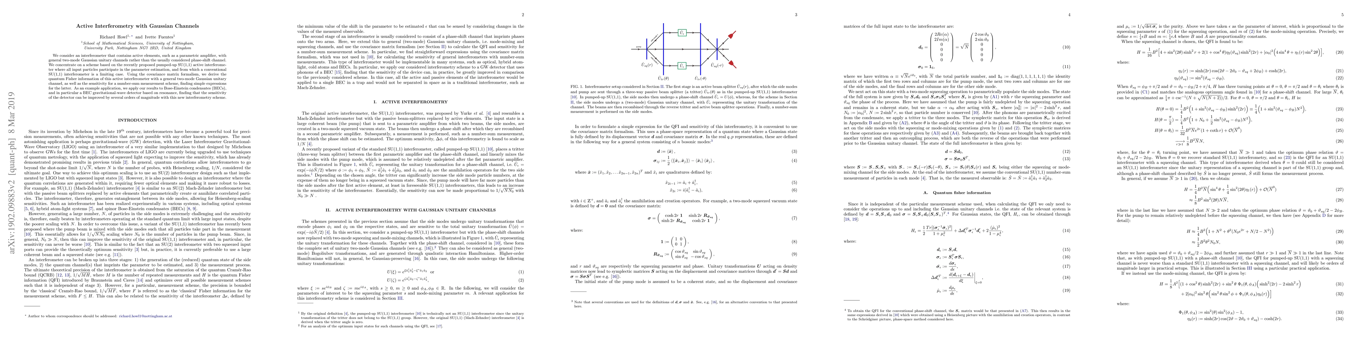 We consider an interferometer that contains active elements, such as a parametric amplifier, with general two-mode Gaussian unitary channels rather than the usually considered phase-shift channel. We concentrate on a scheme based on the recently proposed pumped-up SU(1,1) active interferometer where all input particles participate in the parameter estimation, and from which a conventional SU(1,1) interferometer is a limiting case. Using the covariance matrix formalism, we derive the quantum Fisher information of this active interferometer with a general two-mode Gaussian unitary channel, as well as the sensitivity for a number-sum measurement scheme, finding simple expressions for the latter. As an example application, we apply our results to Bose-Einstein condensates (BECs), and in particular a BEC gravitational-wave detector based on resonance, finding that the sensitivity of the detector can be improved by several orders of magnitude with this new interferometry scheme.