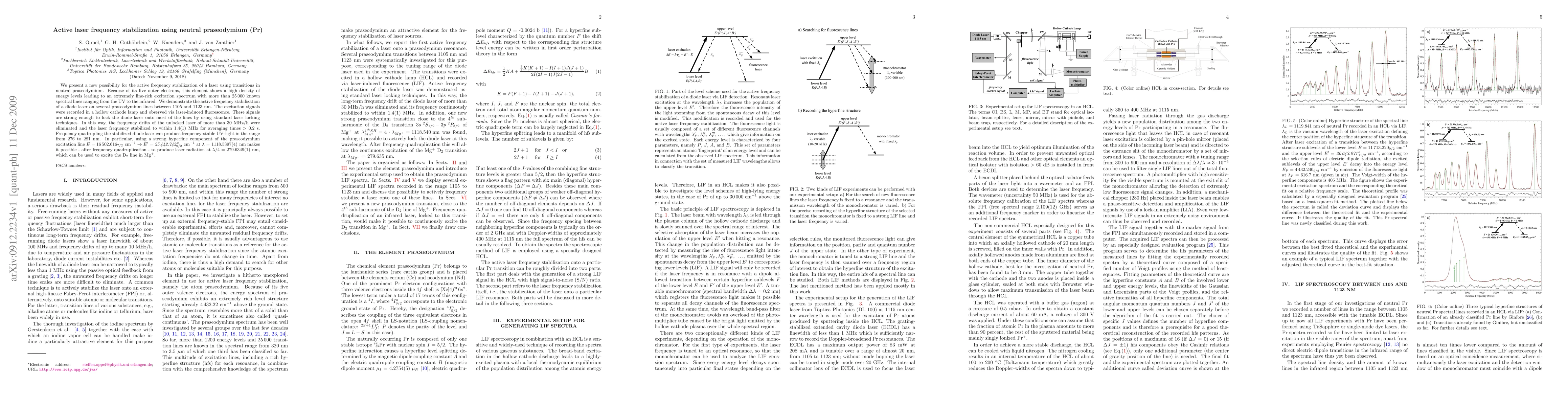This paper details an innovative method for active laser frequency stabilization using neutral praseodymium, exploiting its dense energy levels for precise control over diode laser frequencies. The stabilized laser achieves a frequency stability of 1.4(1) MHz and can produce frequency-stable UV-light, with potential applications in spectroscopy.