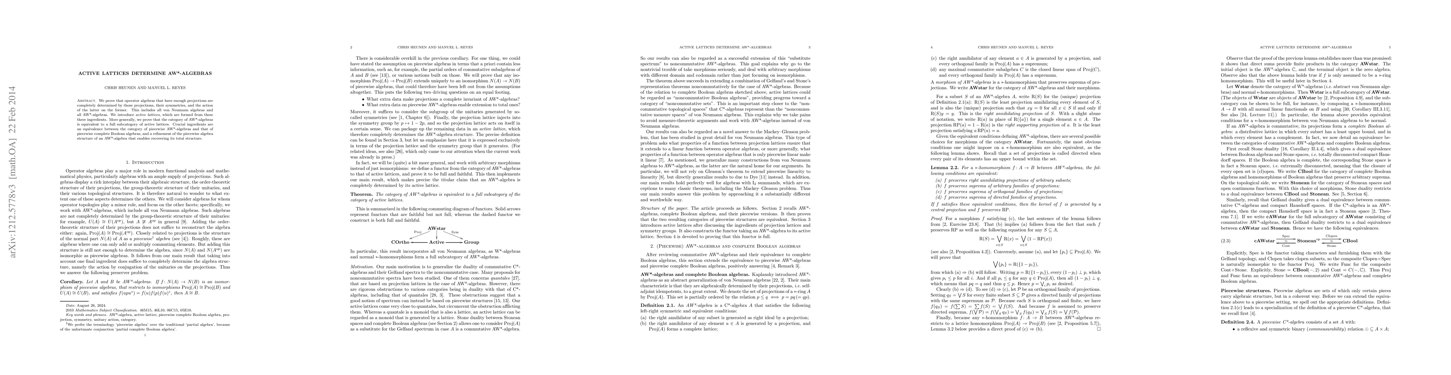 We prove that operator algebras that have enough projections are completely determined by those projections, their symmetries, and the action of the latter on the former. This includes all von Neumann algebras and all AW*-algebras. We introduce active lattices, which are formed from these three ingredients. More generally, we prove that the category of AW*-algebras is equivalent to a full subcategory of active lattices. Crucial ingredients are an equivalence between the category of piecewise AW*-algebras and that of piecewise complete Boolean algebras, and a refinement of the piecewise algebra structure of an AW*-algebra that enables recovering its total structure.