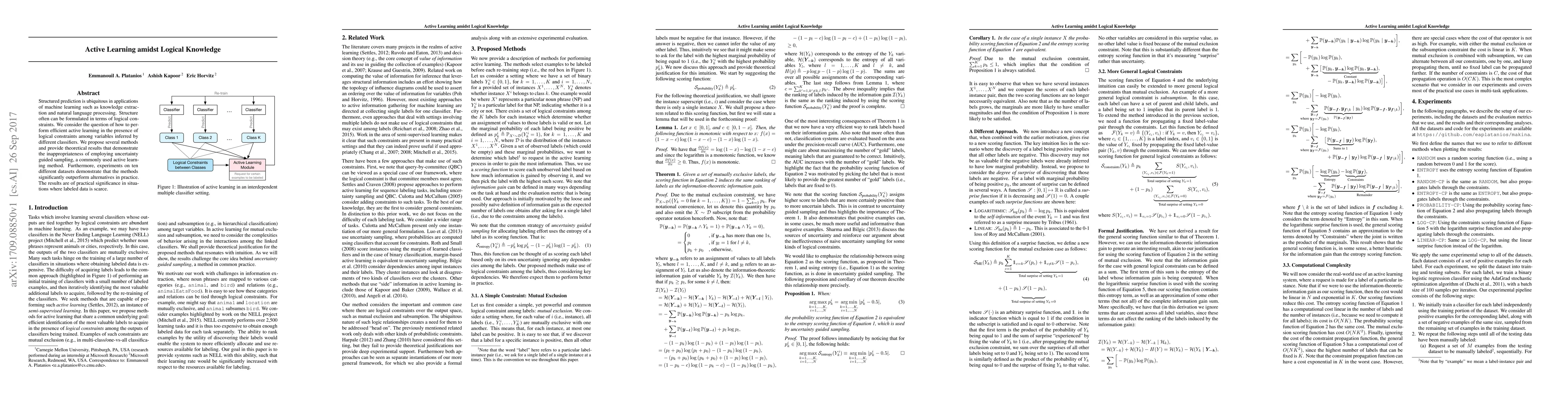 Structured prediction is ubiquitous in applications of machine learning such as knowledge extraction and natural language processing. Structure often can be formulated in terms of logical constraints. We consider the question of how to perform efficient active learning in the presence of logical constraints among variables inferred by different classifiers. We propose several methods and provide theoretical results that demonstrate the inappropriateness of employing uncertainty guided sampling, a commonly used active learning method. Furthermore, experiments on ten different datasets demonstrate that the methods significantly outperform alternatives in practice. The results are of practical significance in situations where labeled data is scarce.