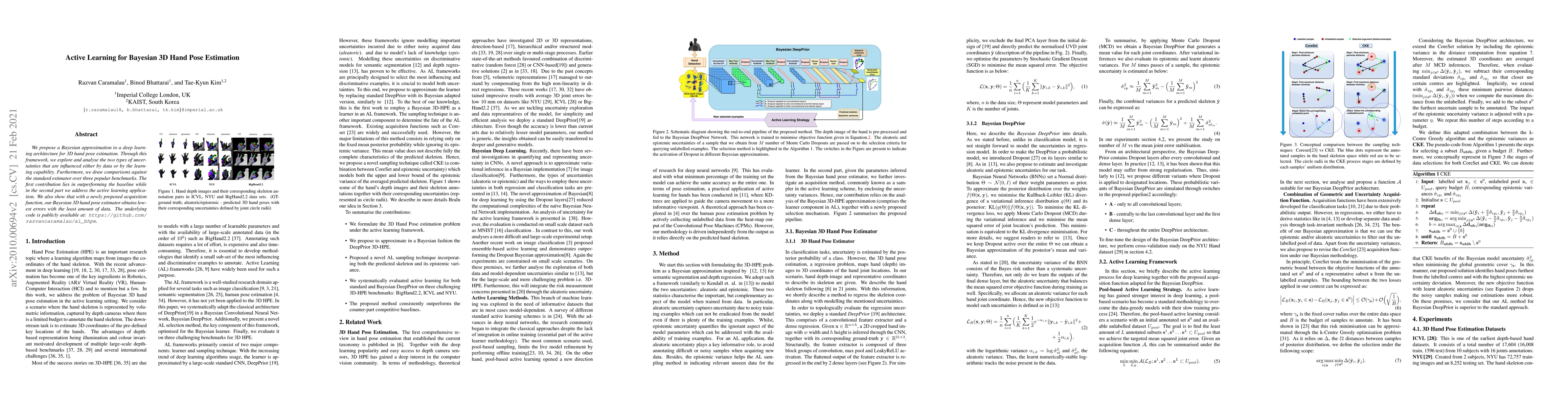 This paper proposes a Bayesian deep learning approach for 3D hand pose estimation, outperforming standard estimators on three benchmarks. It introduces an active learning method with a new acquisition function that achieves lower errors with minimal data, demonstrating improved performance and efficiency.