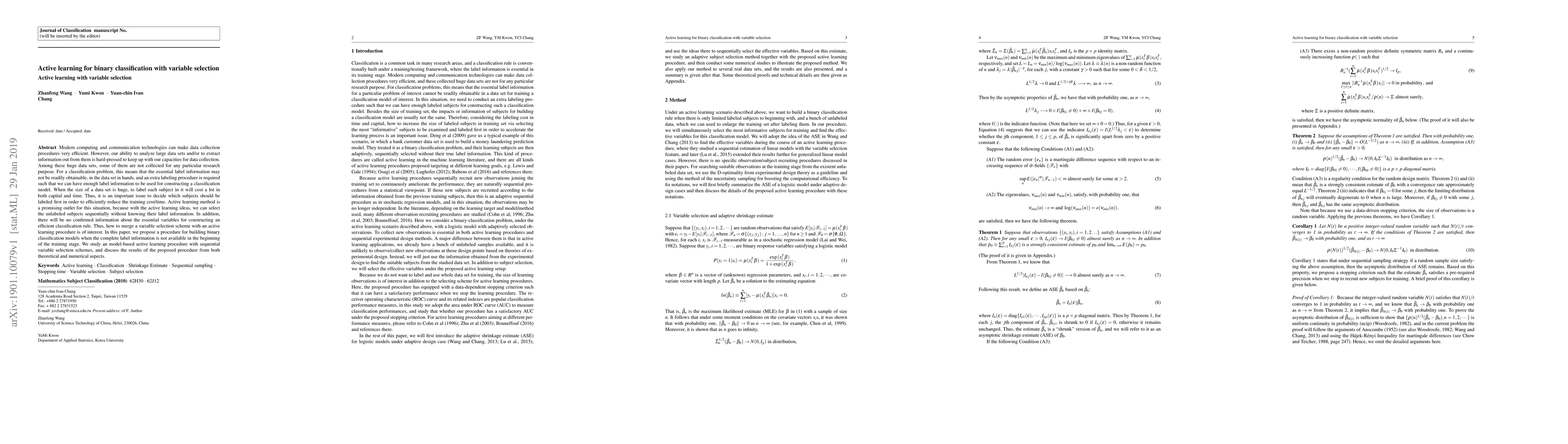 Modern computing and communication technologies can make data collection procedures very efficient. However, our ability to analyze large data sets and/or to extract information out from them is hard-pressed to keep up with our capacities for data collection. Among these huge data sets, some of them are not collected for any particular research purpose. For a classification problem, this means that the essential label information may not be readily obtainable, in the data set in hands, and an extra labeling procedure is required such that we can have enough label information to be used for constructing a classification model. When the size of a data set is huge, to label each subject in it will cost a lot in both capital and time. Thus, it is an important issue to decide which subjects should be labeled first in order to efficiently reduce the training cost/time. Active learning method is a promising outlet for this situation, because with the active learning ideas, we can select the unlabeled subjects sequentially without knowing their label information. In addition, there will be no confirmed information about the essential variables for constructing an efficient classification rule. Thus, how to merge a variable selection scheme with an active learning procedure is of interest. In this paper, we propose a procedure for building binary classification models when the complete label information is not available in the beginning of the training stage. We study an model-based active learning procedure with sequential variable selection schemes, and discuss the results of the proposed procedure from both theoretical and numerical aspects.