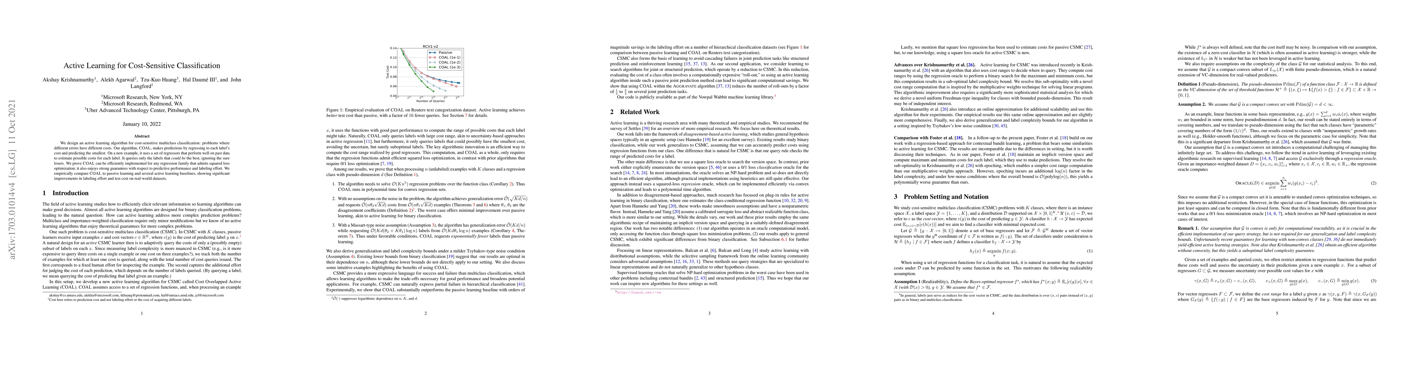This paper introduces COAL, an active learning algorithm for cost-sensitive multiclass classification, which queries labels with the lowest estimated cost and demonstrates significant improvements in labeling effort and test cost compared to passive learning and other active baselines. The algorithm is efficiently implementable and provides strong theoretical guarantees.