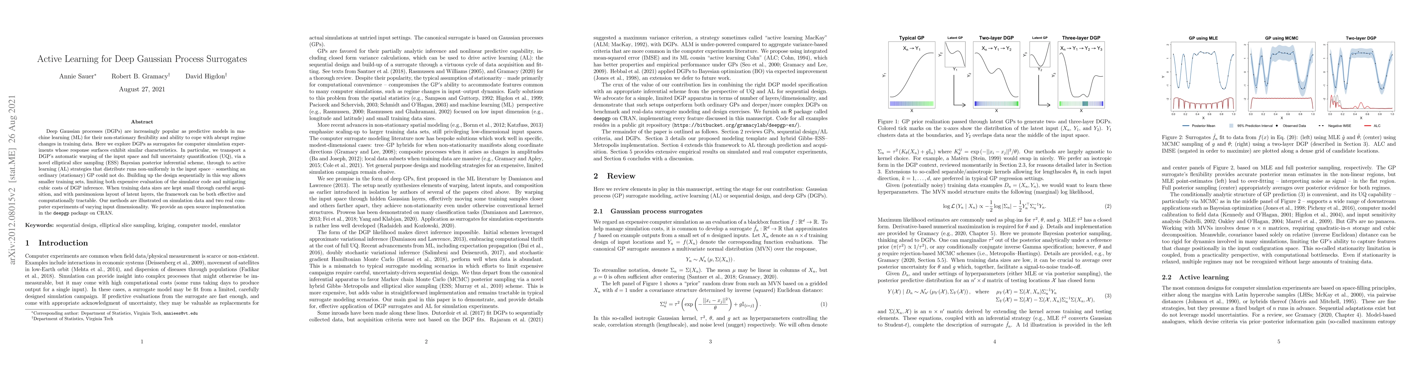 Deep Gaussian processes (DGPs) are increasingly popular as predictive models in machine learning (ML) for their non-stationary flexibility and ability to cope with abrupt regime changes in training data. Here we explore DGPs as surrogates for computer simulation experiments whose response surfaces exhibit similar characteristics. In particular, we transport a DGP's automatic warping of the input space and full uncertainty quantification (UQ), via a novel elliptical slice sampling (ESS) Bayesian posterior inferential scheme, through to active learning (AL) strategies that distribute runs non-uniformly in the input space -- something an ordinary (stationary) GP could not do. Building up the design sequentially in this way allows smaller training sets, limiting both expensive evaluation of the simulator code and mitigating cubic costs of DGP inference. When training data sizes are kept small through careful acquisition, and with parsimonious layout of latent layers, the framework can be both effective and computationally tractable. Our methods are illustrated on simulation data and two real computer experiments of varying input dimensionality. We provide an open source implementation in the "deepgp" package on CRAN.