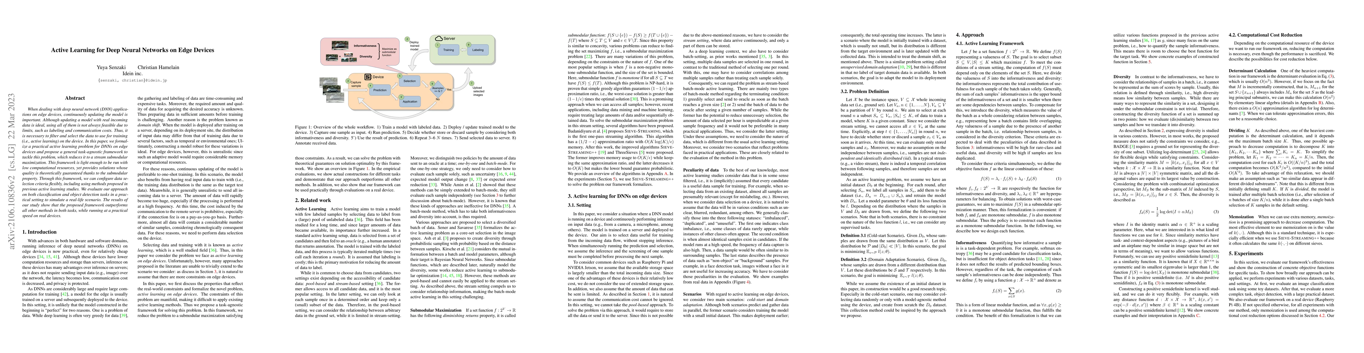 This paper proposes a task-agnostic active learning framework for deep neural networks on edge devices, optimizing data selection for training through stream submodular maximization. The framework is efficient and outperforms other methods in classification and object detection tasks while maintaining practical speed.