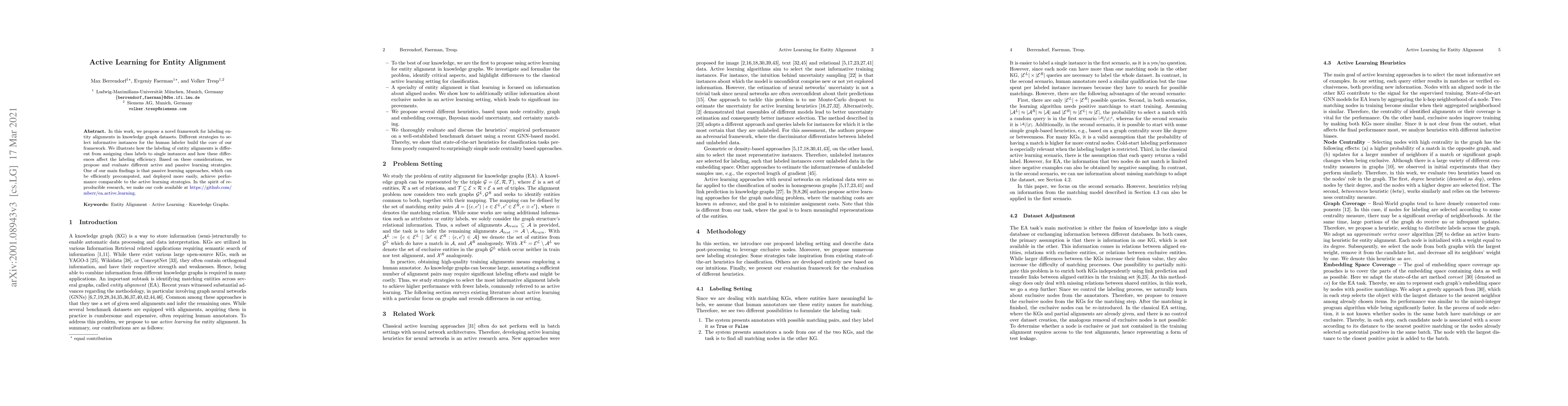 This paper introduces a framework for labeling entity alignments using active learning strategies, comparing them to passive approaches. It finds that precomputed passive learning methods can achieve performance comparable to active strategies, highlighting the efficiency of the former.