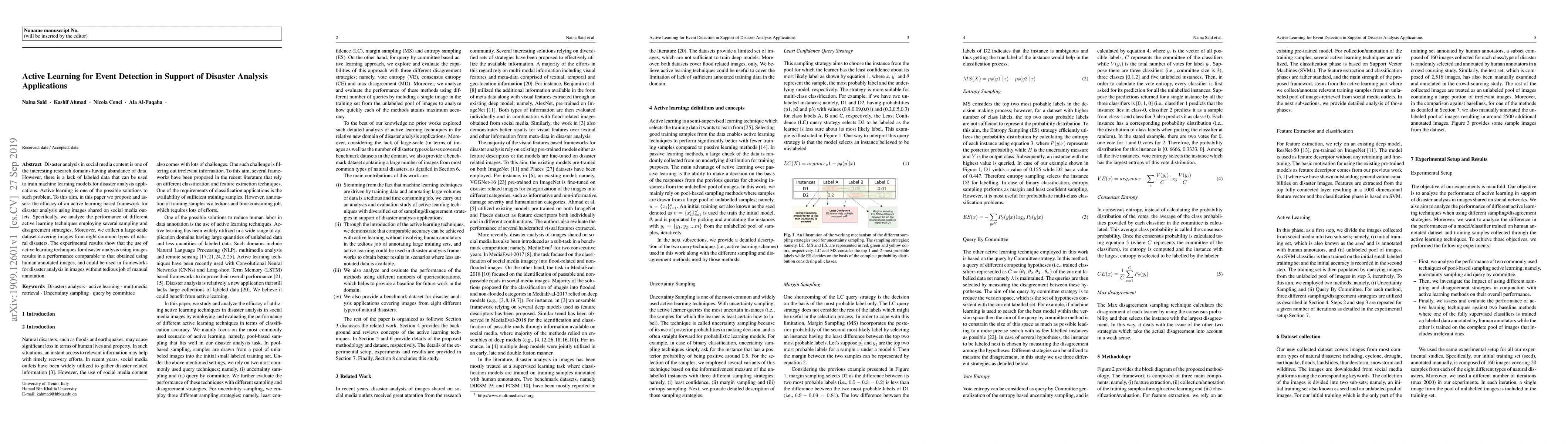 Disaster analysis in social media content is one of the interesting research domains having abundance of data. However, there is a lack of labeled data that can be used to train machine learning models for disaster analysis applications. Active learning is one of the possible solutions to such problem. To this aim, in this paper we propose and assess the efficacy of an active learning based framework for disaster analysis using images shared on social media outlets. Specifically, we analyze the performance of different active learning techniques employing several sampling and disagreement strategies. Moreover, we collect a large-scale dataset covering images from eight common types of natural disasters. The experimental results show that the use of active learning techniques for disaster analysis using images results in a performance comparable to that obtained using human annotated images, and could be used in frameworks for disaster analysis in images without tedious job of manual annotation.