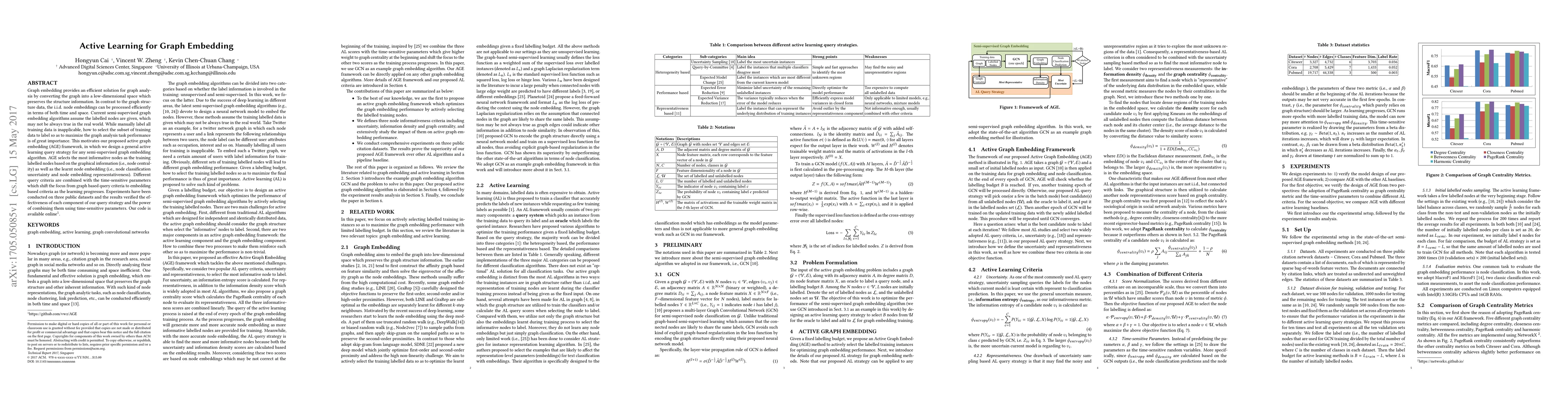 The paper proposes an active graph embedding (AGE) framework to enhance semi-supervised graph embedding by selecting the most informative nodes for labelling, balancing graphical and embedding-based criteria. Experiments on three datasets demonstrate the effectiveness of the proposed query strategy.