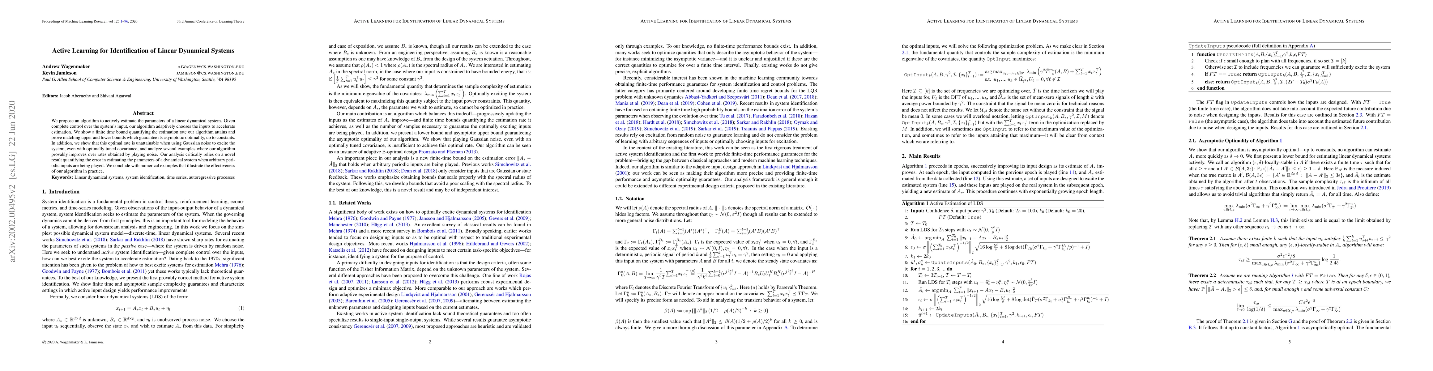 This research proposes an algorithm that actively estimates the parameters of linear dynamical systems by adapting inputs to accelerate estimation, achieving a finite time bound and asymptotic optimality, with numerical examples illustrating its effectiveness.