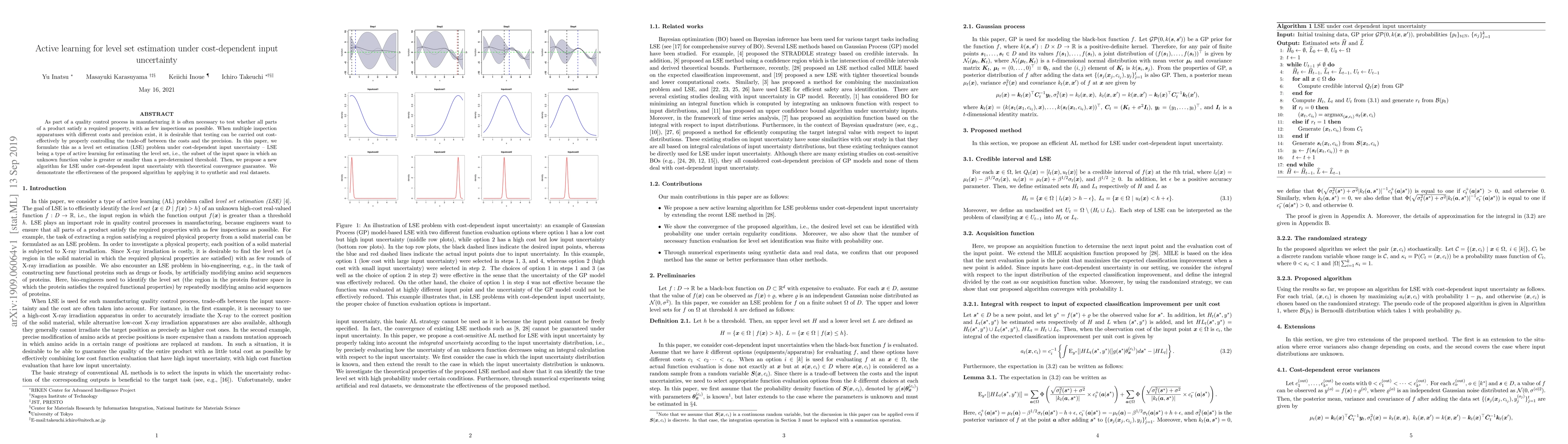 The paper proposes an active learning method for level set estimation (LSE) under cost-dependent input uncertainty, formulated as an optimization problem. It introduces a new algorithm with theoretical convergence guarantees and demonstrates its effectiveness on synthetic and real datasets.