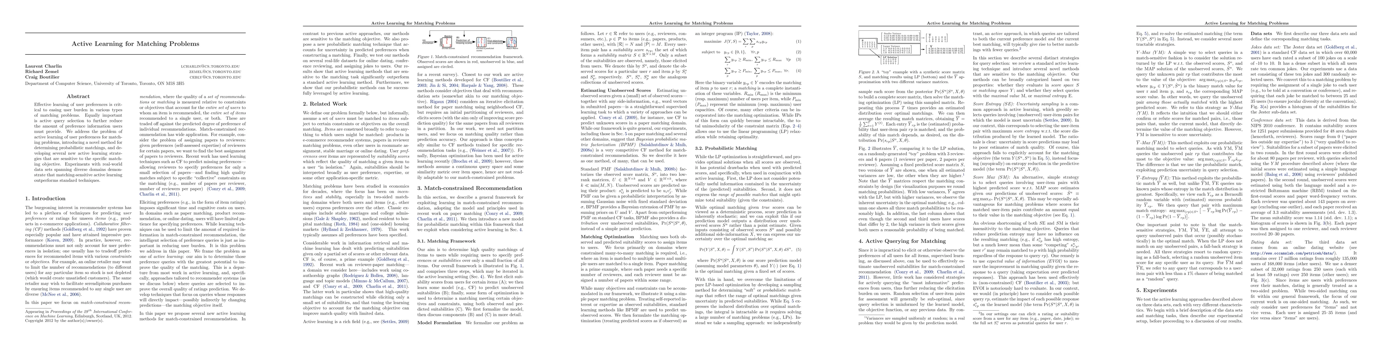 Summary: This paper introduces a novel method for probabilistic matchings and develops active learning strategies tailored to specific matching objectives to reduce user preference input. Experiments show improved performance across various domains.