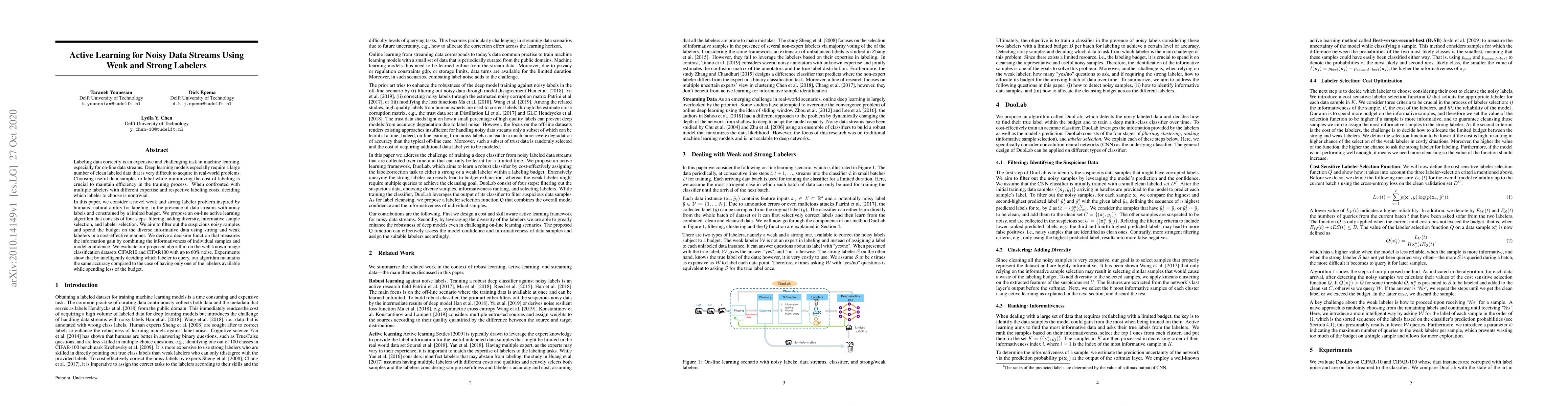 Labeling data correctly is an expensive and challenging task in machine learning, especially for on-line data streams. Deep learning models especially require a large number of clean labeled data that is very difficult to acquire in real-world problems. Choosing useful data samples to label while minimizing the cost of labeling is crucial to maintain efficiency in the training process. When confronted with multiple labelers with different expertise and respective labeling costs, deciding which labeler to choose is nontrivial. In this paper, we consider a novel weak and strong labeler problem inspired by humans natural ability for labeling, in the presence of data streams with noisy labels and constrained by a limited budget. We propose an on-line active learning algorithm that consists of four steps: filtering, adding diversity, informative sample selection, and labeler selection. We aim to filter out the suspicious noisy samples and spend the budget on the diverse informative data using strong and weak labelers in a cost-effective manner. We derive a decision function that measures the information gain by combining the informativeness of individual samples and model confidence. We evaluate our proposed algorithm on the well-known image classification datasets CIFAR10 and CIFAR100 with up to 60% noise. Experiments show that by intelligently deciding which labeler to query, our algorithm maintains the same accuracy compared to the case of having only one of the labelers available while spending less of the budget.