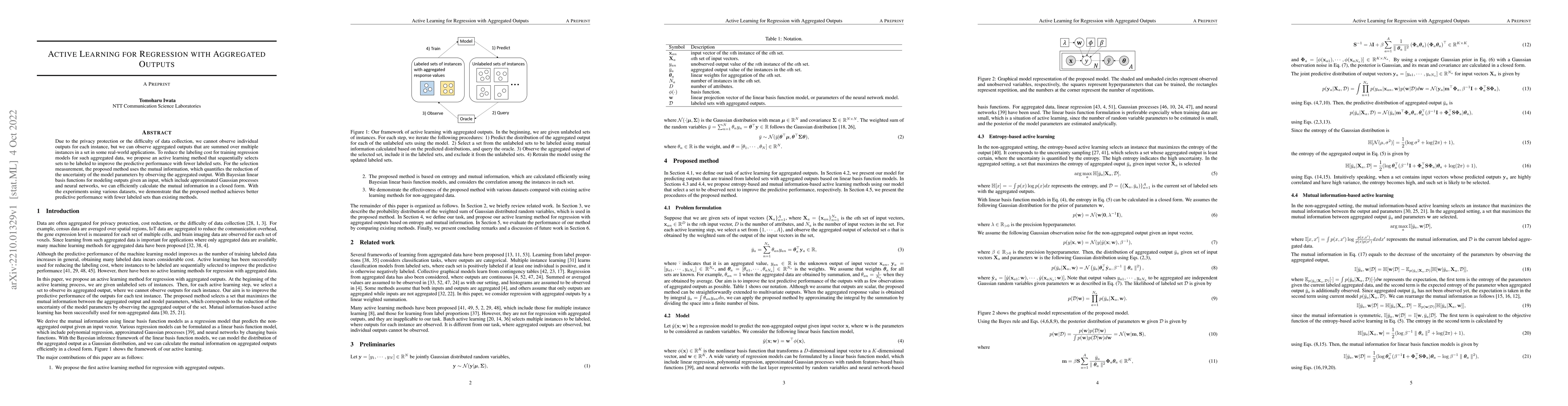 This paper proposes an active learning method for regression models using aggregated outputs, selecting sets to label based on mutual information to reduce labeling costs. The method employs Bayesian linear basis functions for efficient calculation and demonstrates improved performance with fewer labeled sets compared to existing approaches.