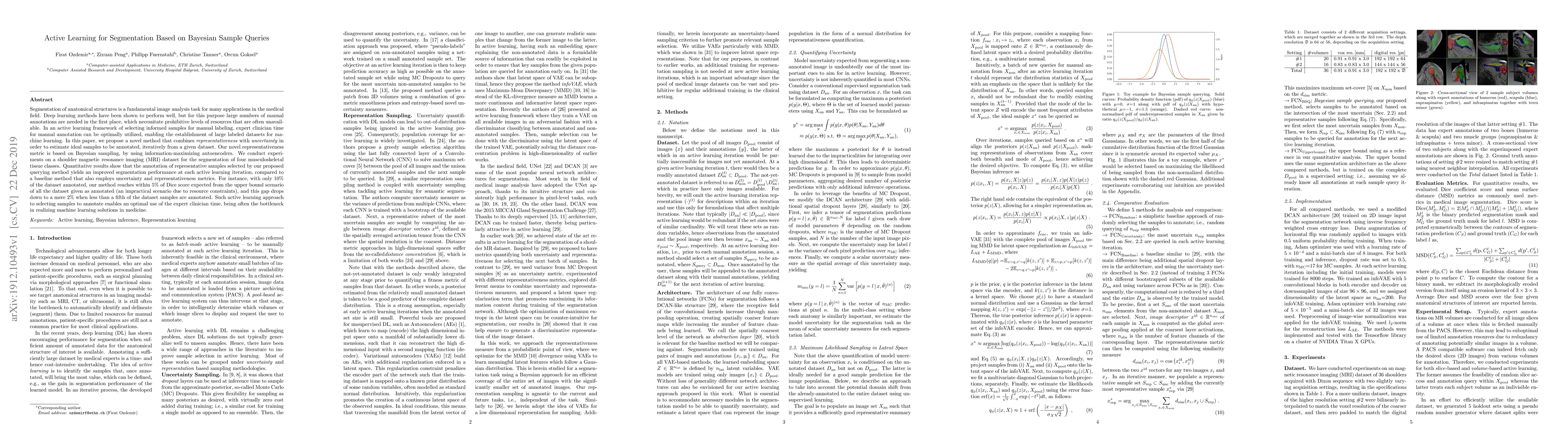 This paper proposes an active learning method for medical image segmentation that optimally selects samples for manual annotation based on a combination of representativeness and uncertainty. Using Bayesian sampling and information-maximizing autoencoders, the method iteratively identifies ideal samples to annotate, significantly improving segmentation performance with limited annotations, thus optimizing the use of clinician time.