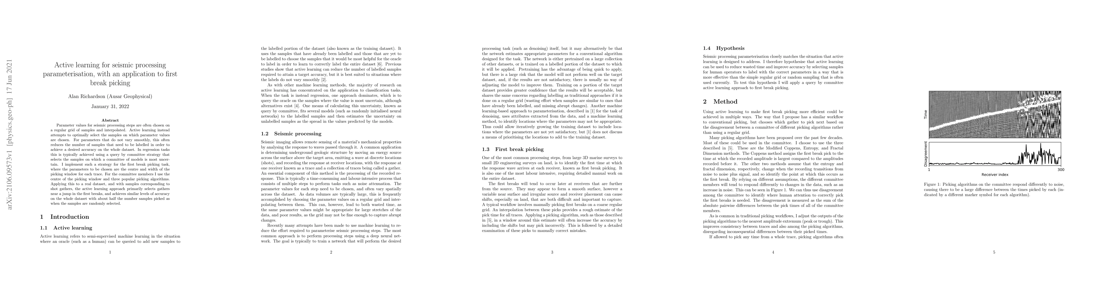 This paper proposes an active learning strategy for seismic processing parameterisation, specifically for first break picking, using a query by committee approach. The method selects optimal samples to label, significantly reducing the number of required samples compared to random selection, achieving similar accuracy levels.