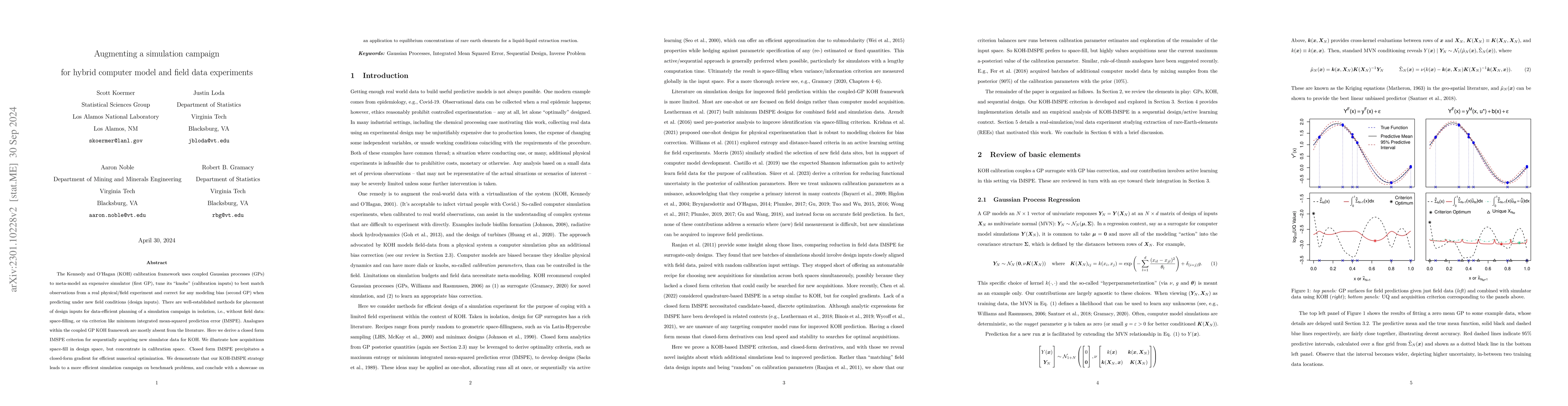 The Kennedy and O'Hagan (KOH) calibration framework uses coupled Gaussian processes (GPs) to meta-model an expensive simulator (first GP), tune its 'knobs' (calibration inputs) to best match observations from a real physical/field experiment and correct for any modeling bias (second GP) when predicting under novel field conditions (design inputs). There are well-established methods for placement of design inputs for data-efficient planning of a simulation campaign in isolation, i.e., without field data: space-filling, or via criteria like minimum integrated mean-squared prediction error (IMSPE). Analogues within the coupled GP KOH framework are mostly absent from the literature. Here we derive a novel, closed from IMSPE criteria for sequentially acquiring new simulator data in an active learning setting for KOH. We illustrate how acquisitions space-fill in design space, but concentrate in calibration space. Closed form IMSPE precipitates a closed-form gradient for efficient numerical optimization. We demonstrate that such acquisitions lead to a more efficient simulation campaign on benchmark problems, and conclude with a showcase on a motivating problem involving prediction of equilibrium concentrations of rare earth elements for a liquid-liquid extraction reaction.