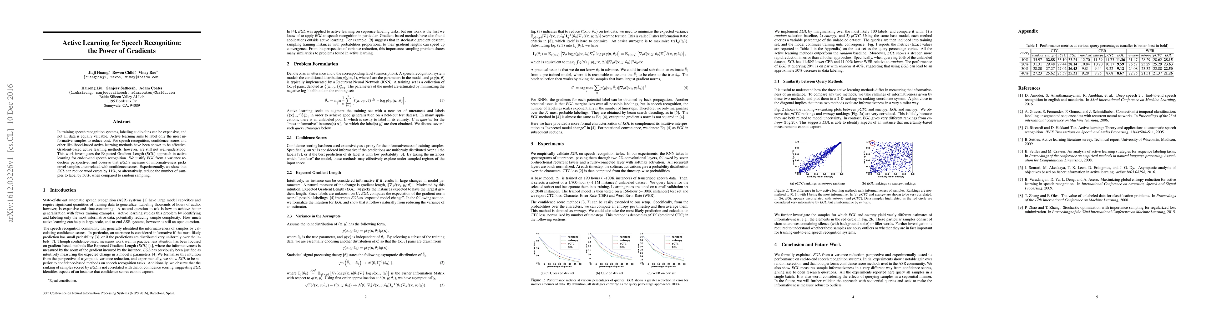 This research paper explores the effectiveness of a gradient-based active learning method called Expected Gradient Length (EGL) for improving speech recognition systems. It shows that EGL can reduce word errors by 11% or the number of samples to label by 50% compared to random sampling.