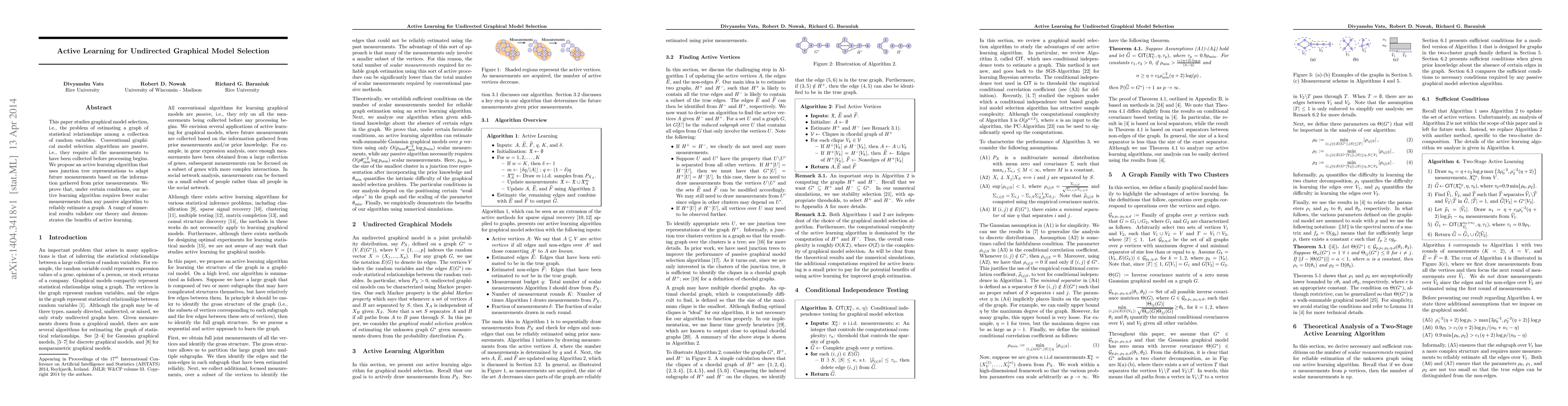 This paper introduces an active learning algorithm for selecting undirected graphical models, which adaptively gathers measurements based on prior data. It demonstrates that this approach requires fewer measurements than passive methods to reliably estimate the graph, supported by theoretical proofs and numerical validation.