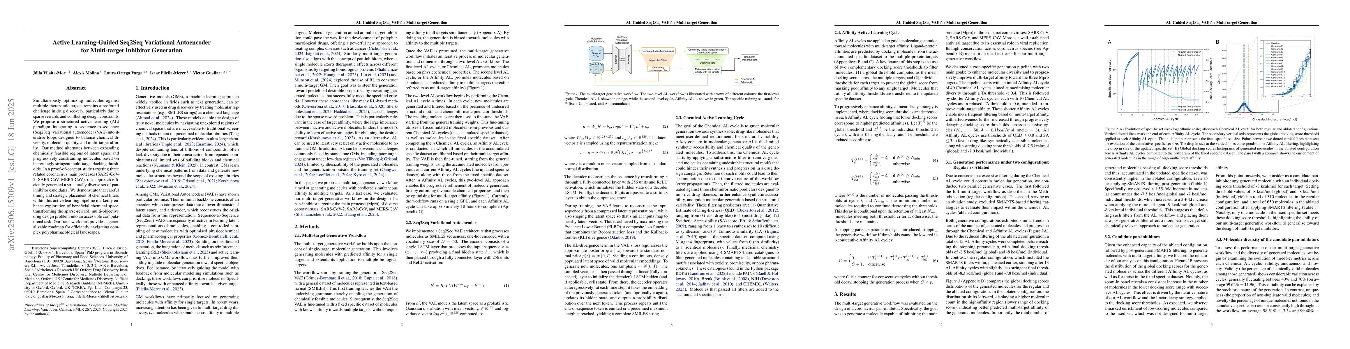 The research proposes an active learning-guided Seq2Seq Variational Autoencoder (VAE) for multi-target inhibitor generation, balancing chemical diversity, molecular quality, and multi-target affinity through iterative loops. It alternates between expanding chemically feasible regions of latent space and progressively constraining molecules based on increasingly stringent multi-target docking thresholds.