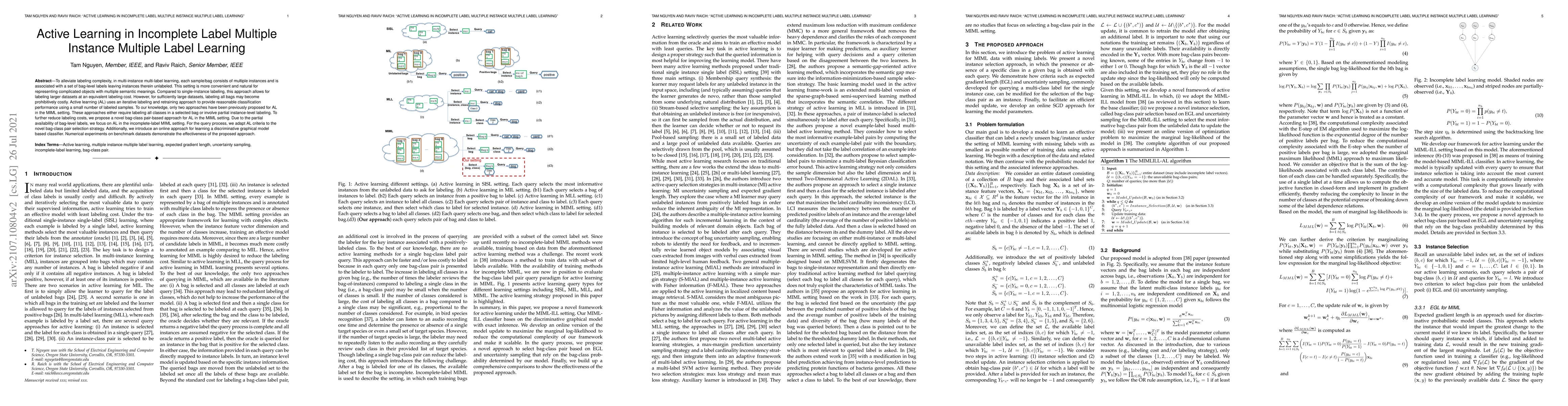 This paper proposes a novel active learning method for multiple instance multiple label (MIML) learning in the incomplete-label setting, utilizing a discriminative graphical model and an online stochastic gradient descent algorithm to iteratively label and update the model, aiming to achieve reasonable classification performance with minimal labeling effort. Experimental results demonstrate the robustness of the proposed approach.