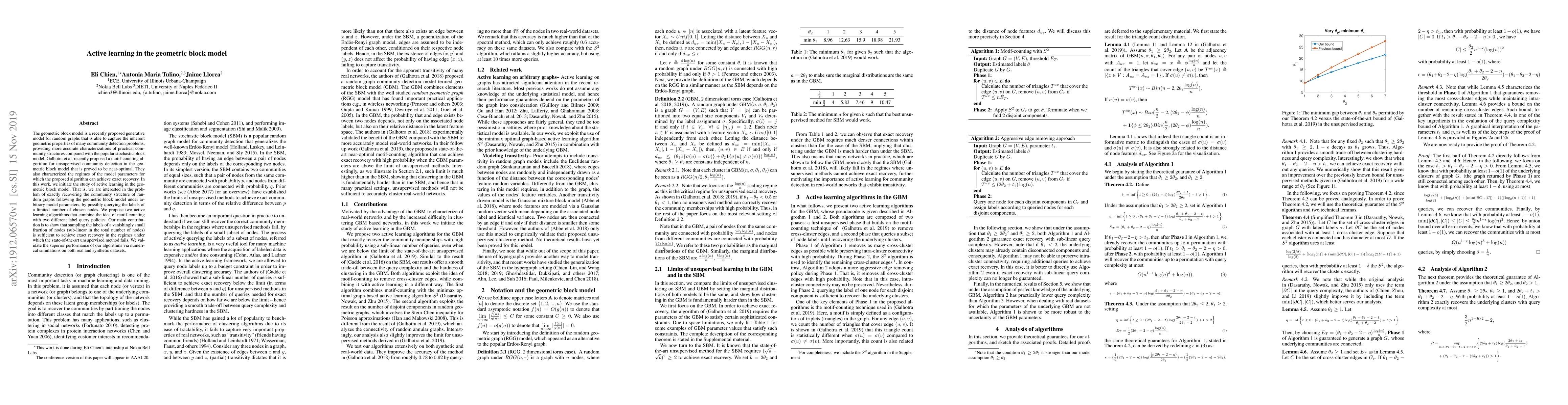 The geometric block model is a recently proposed generative model for random graphs that is able to capture the inherent geometric properties of many community detection problems, providing more accurate characterizations of practical community structures compared with the popular stochastic block model. Galhotra et al. recently proposed a motif-counting algorithm for unsupervised community detection in the geometric block model that is proved to be near-optimal. They also characterized the regimes of the model parameters for which the proposed algorithm can achieve exact recovery. In this work, we initiate the study of active learning in the geometric block model. That is, we are interested in the problem of exactly recovering the community structure of random graphs following the geometric block model under arbitrary model parameters, by possibly querying the labels of a limited number of chosen nodes. We propose two active learning algorithms that combine the idea of motif-counting with two different label query policies. Our main contribution is to show that sampling the labels of a vanishingly small fraction of nodes (sub-linear in the total number of nodes) is sufficient to achieve exact recovery in the regimes under which the state-of-the-art unsupervised method fails. We validate the superior performance of our algorithms via numerical simulations on both real and synthetic datasets.